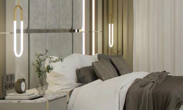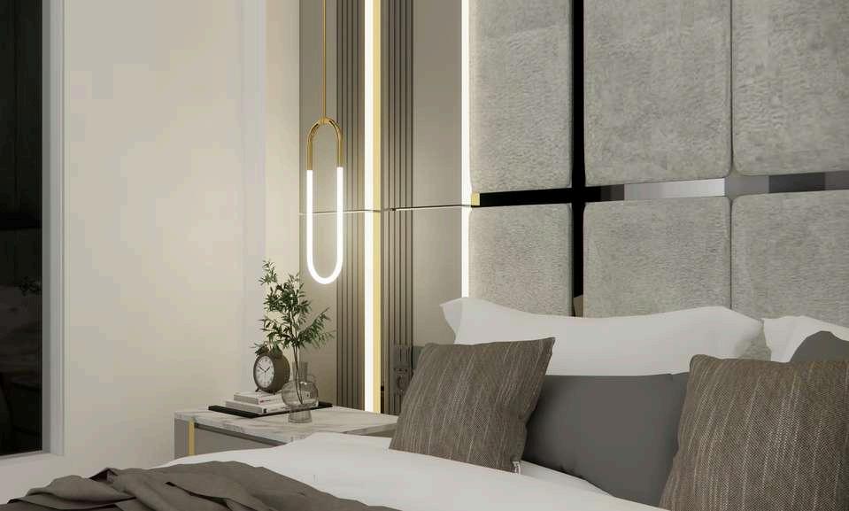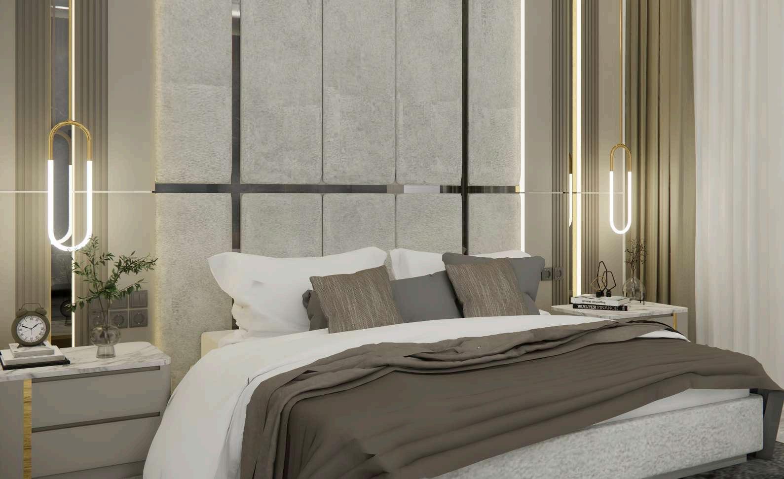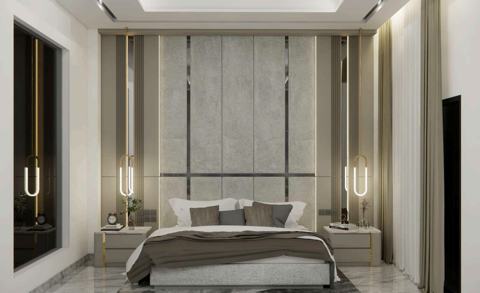 Interior pada master bedroom ini bertemakan elegan dan modern dengan perpaduan warna coklat, abu-abu, dan putih yang menghadirkan suasana tenang, mewah dan nyaman Begitu memasuki ruangan, kesan pertama yang terasa adalah keseimbangan sempurna antara kemewahan dan kenyamanan yang modern. Wall panel belakang kasur merupakan elemen desain yang dipasang di bagian dinding di belakang tempat tidur untuk memberikan tampilan yang lebih elegan pada kamar tidur. Panel ini tidak hanya berfungsi sebagai dekorasi, tetapi juga meningkatkan kesan estetik dan kenyamanan ruang tidur Untuk memberikan kesan mewah wall panel menggunakan material kain yang empuk dengan warna netral seperti abu-abu muda Kain yang dibentangkan dengan rapi dan lembut menciptakan efek visual yang lebih halus dan mewah serta adanya sentuhan warna gold pada hanging lamp dan plat gold pada meja nakas