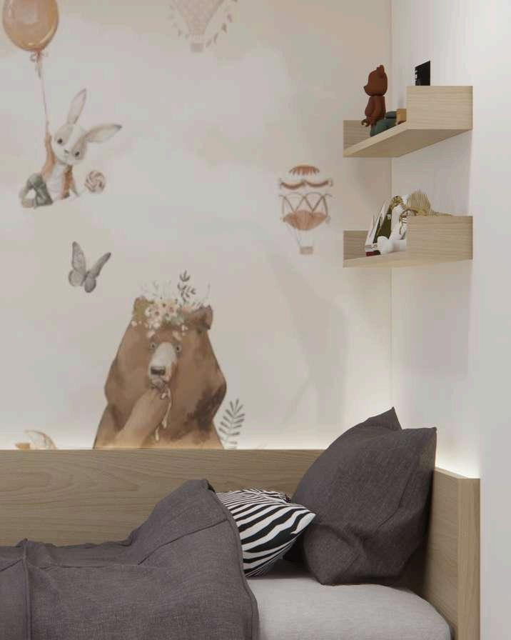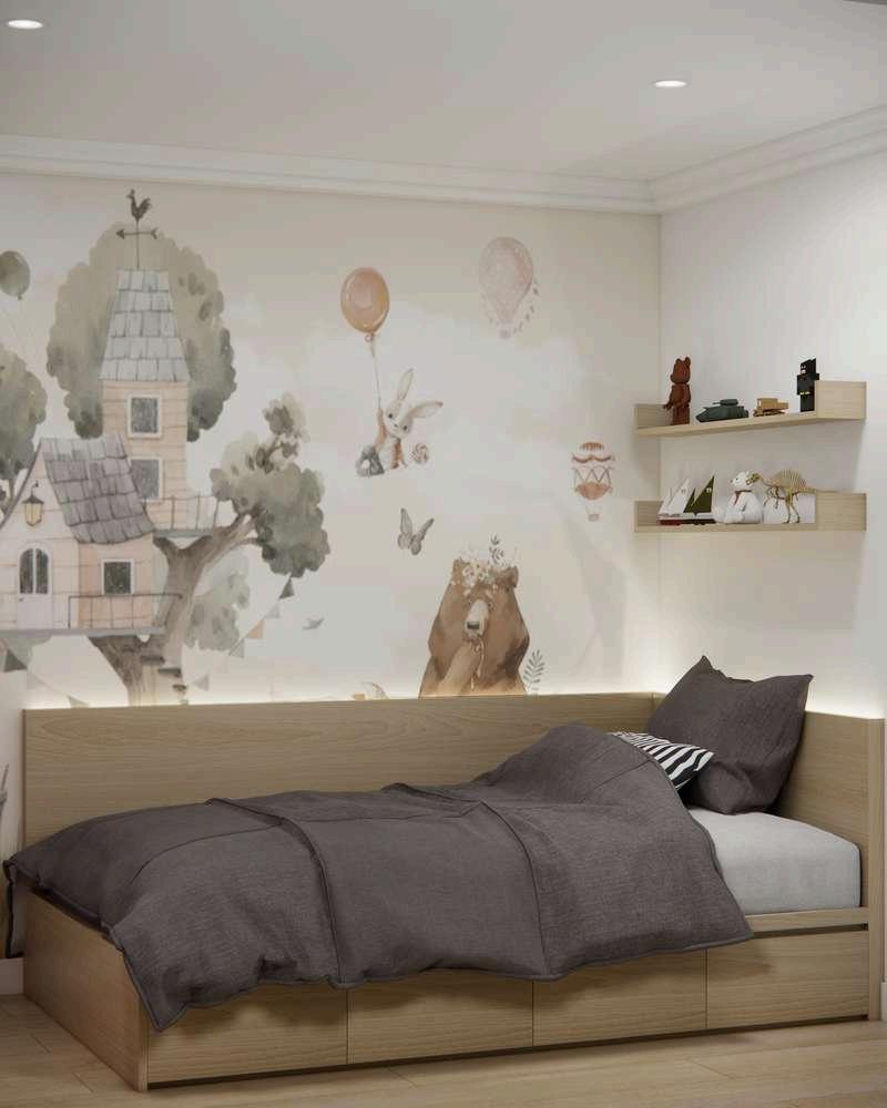 paangan mainan Untuk melengkapi itu semua kamar ini sudah pasti memiliki nuansa yang senada satu sama lain seperti menggunakan hpl bermotif kayu dan hpl warna putih serta disempurnakan dengan wallpaper menggemaskan yang senada untuk