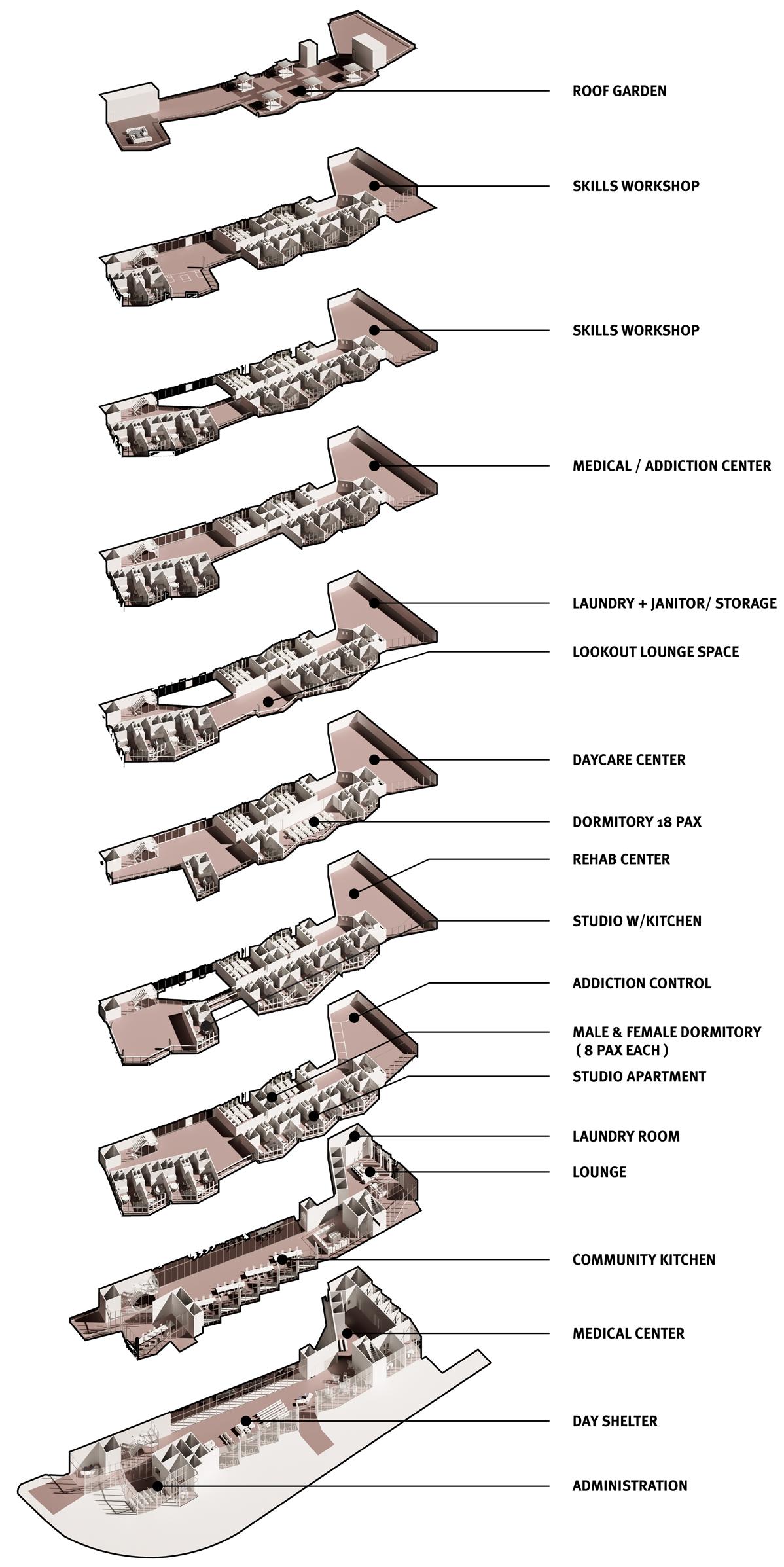 The comments provided were instrumental in shaping the design of my final building by emphasizing the humancentered approach and addressing the nuanced challenges faced by the homeless population. They encouraged me to think beyond providing shelter and focus on creating a space that fosters dignity, safety, and community. By acknowledging the need for privacy, weather protection, and varying durations of stay, I was able to design adaptable dormitories and carefully planned units that respect individual needs while promoting social interaction. Suggestions like inverting the chamfer of the units, ensuring adjacent units have privacy, and incorporating balconies selectively helped refine the architectural expression and usability of the spaces. Distributing programs across levels and introducing multiple entrances improved circulation and accessibility, while ground-level design considerations ensured inclusivity and connection with the urban context. Ultimately, these insights allowed me to create a balanced design where the architecture serves as a framework for human resilience and support rather than a static structure.