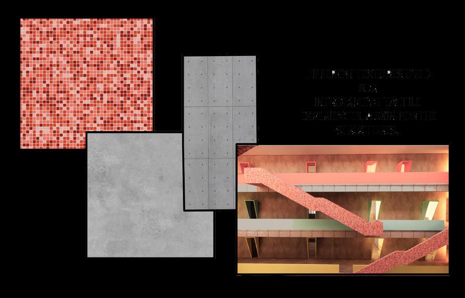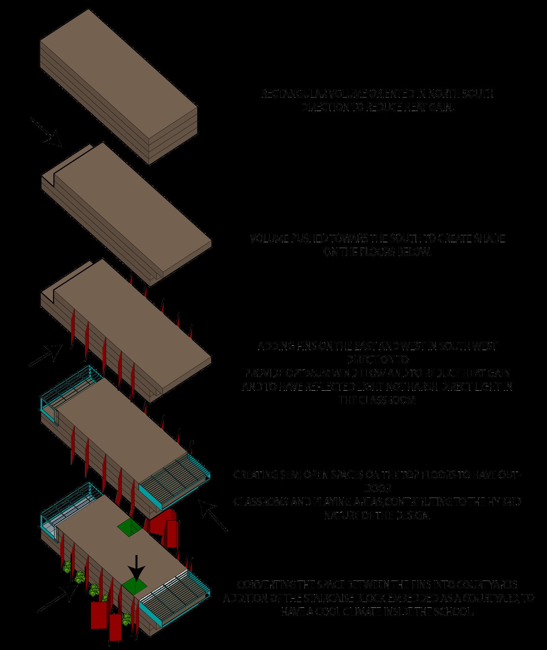the idea is to bring in hybridization into design. the school, when not in use can be turned into a shelter home for the needed. the school is designed around the sense. the use of tactile materials to enhance the experience of touch is proposed. pastel colors for rooms and corridors makes the space visually appealing. double height and semi open spaces are connected at regular intervals to create a play of volume within the premises.