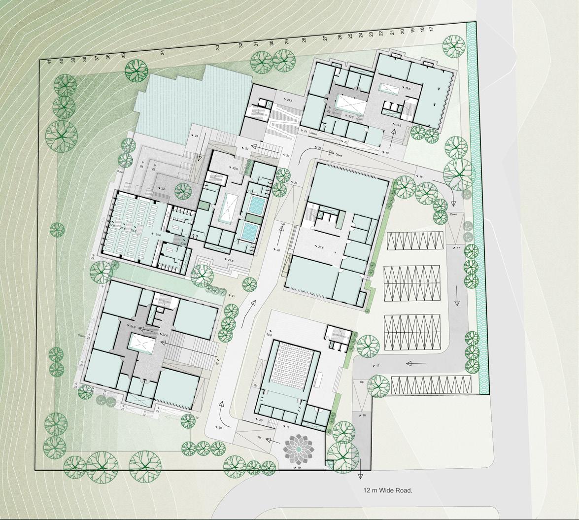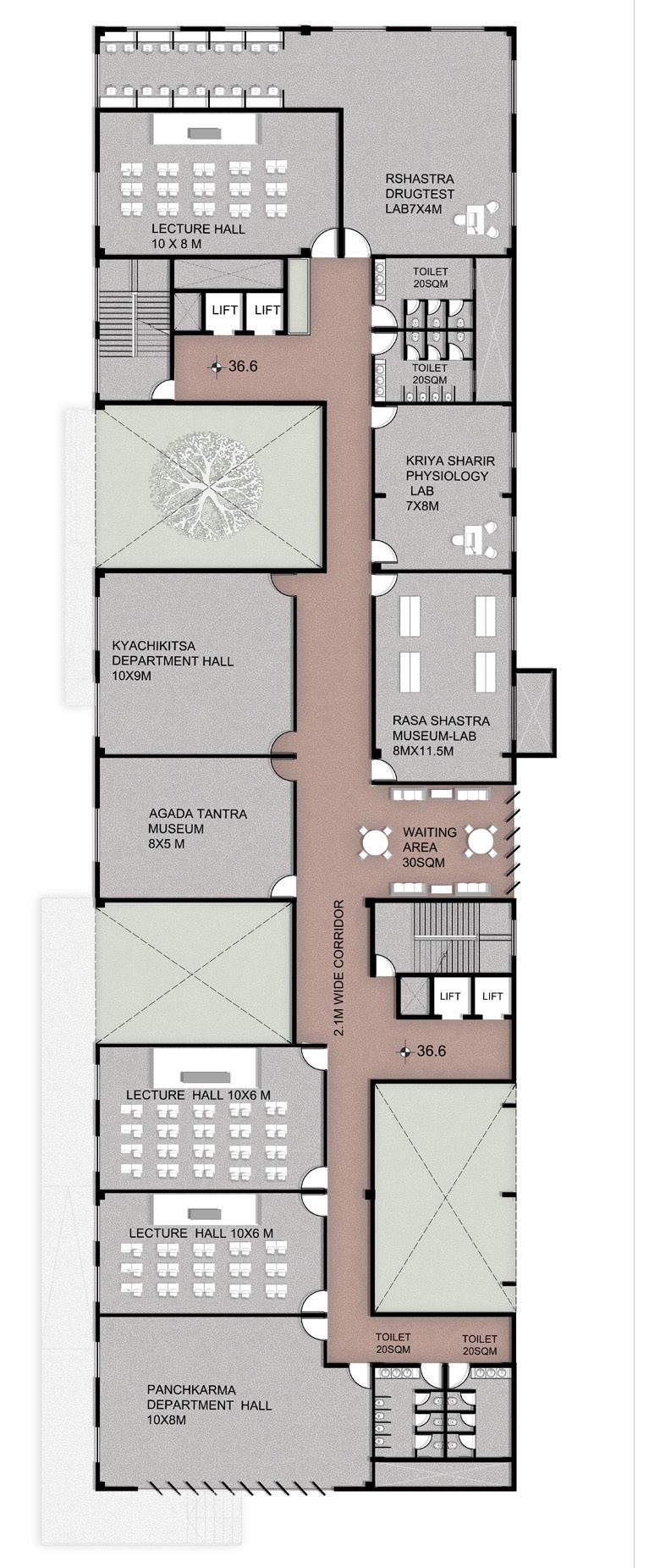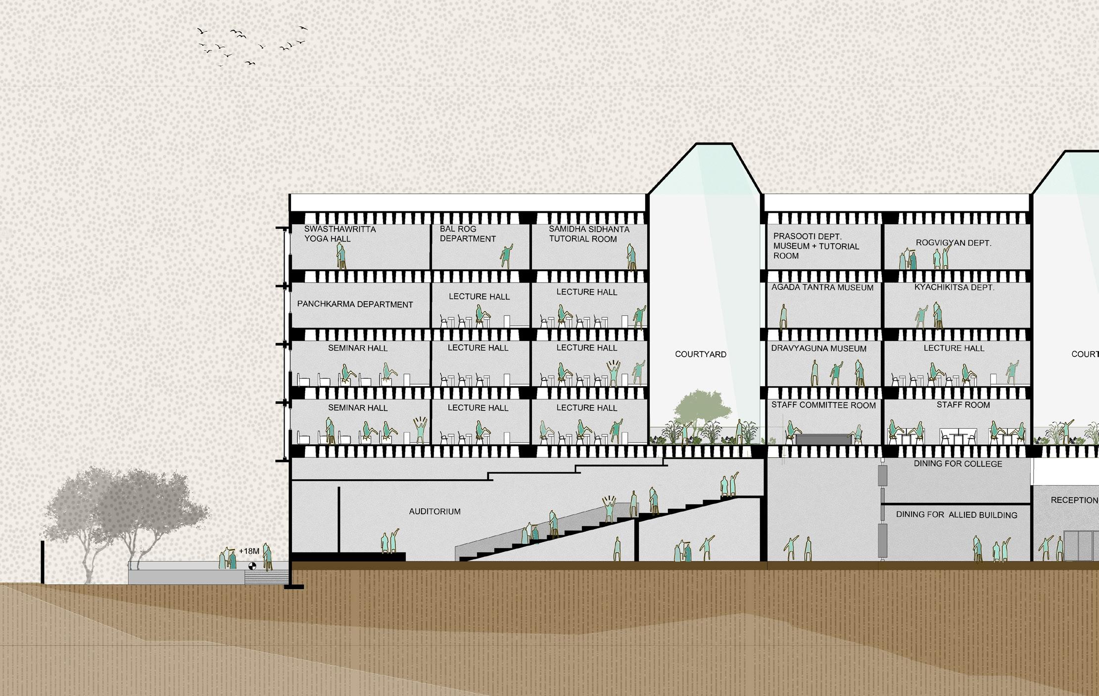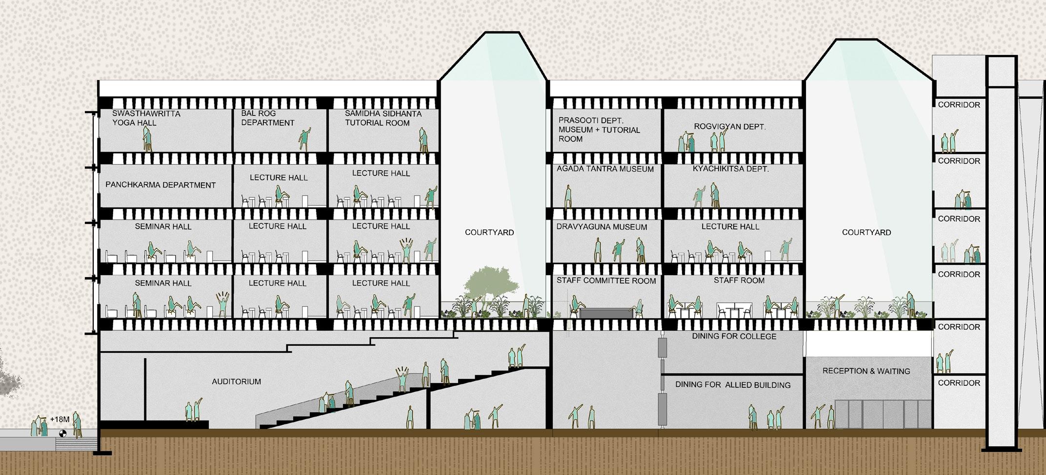 AYURVEDA IS A LIFESTYLE MORE THAN A SCIENCE. The concept comes from the duplication of human and design similarities. The argument that a building also breathes. Dhyana is a center that promotes healing and well being of all of it’s users. With open courtyards and breakout spaces for students to facilities for other users and staff members, Dhyana is a safe and inclusive space for all.