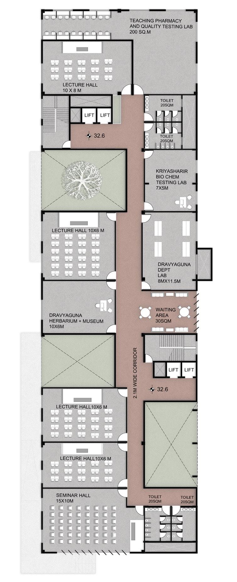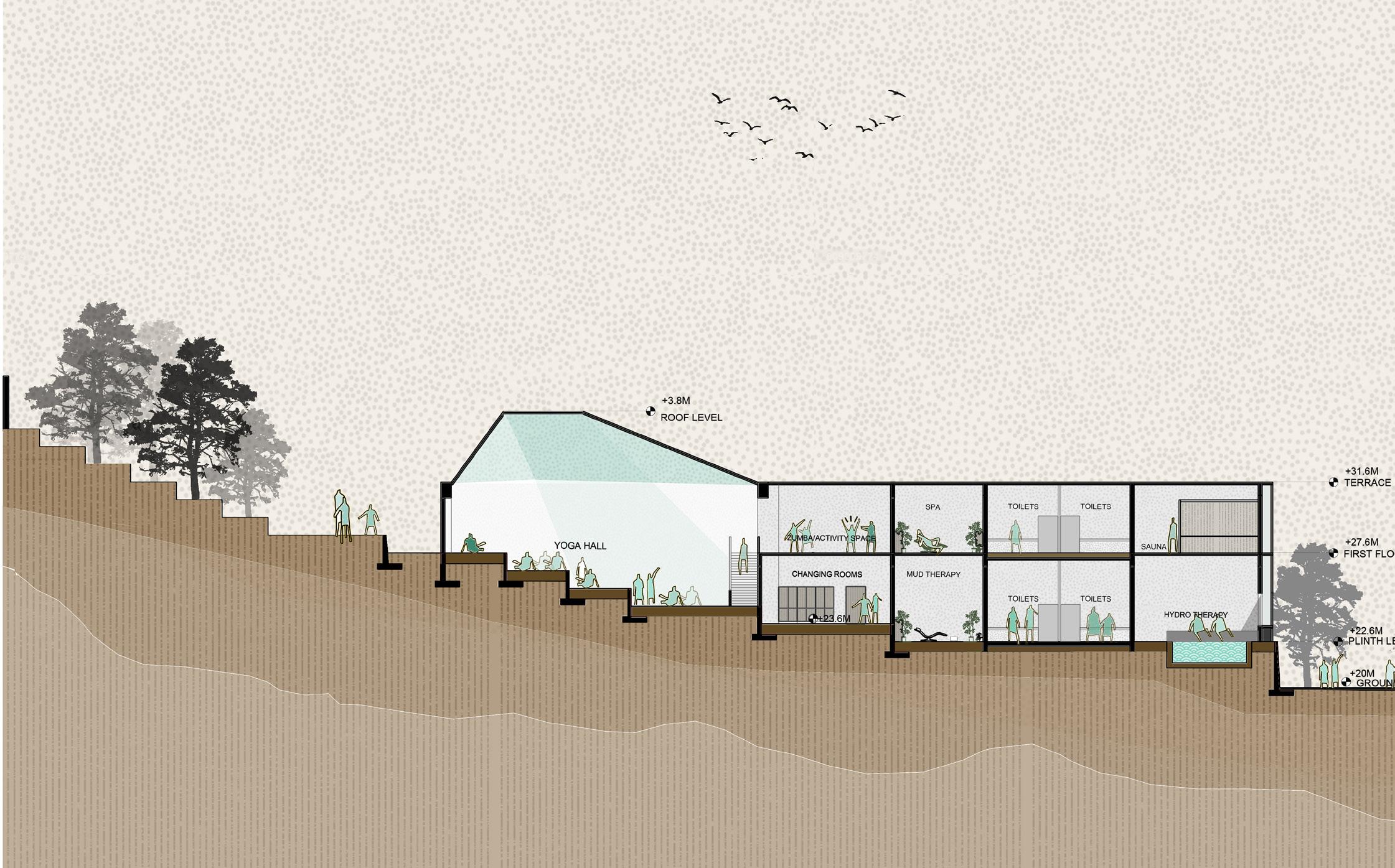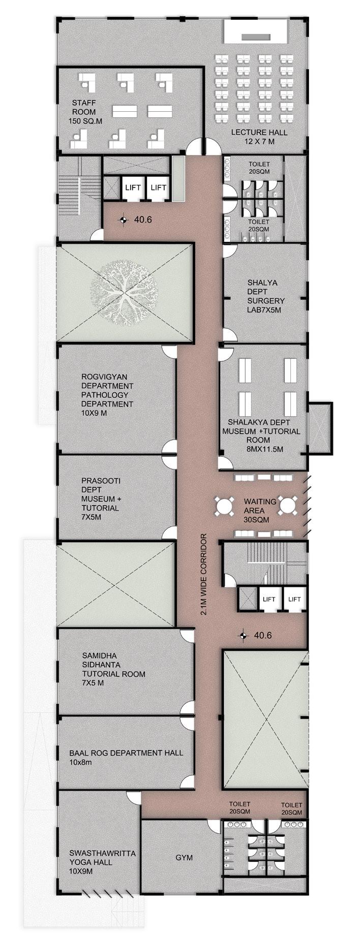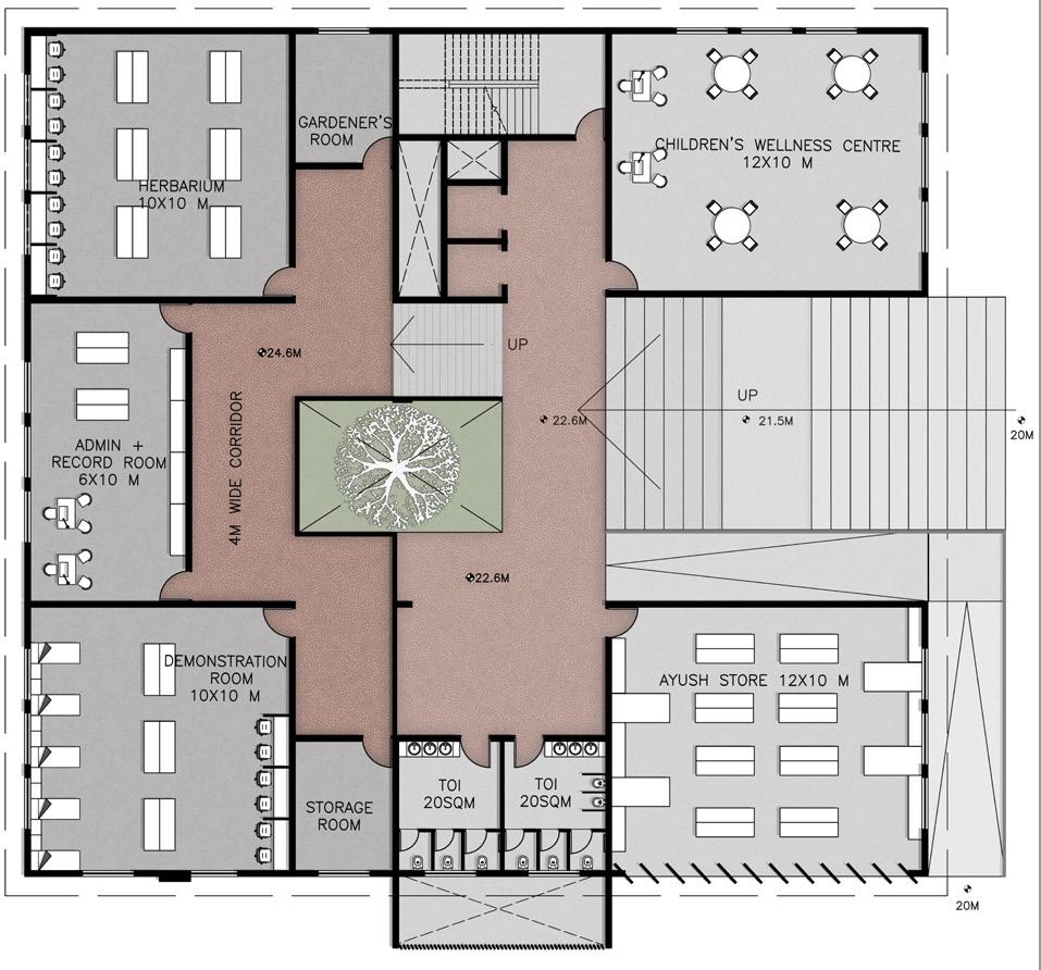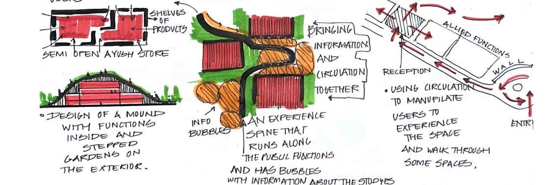 AYURVEDA IS A LIFESTYLE MORE THAN A SCIENCE. The concept comes from the duplication of human and design similarities. The argument that a building also breathes. Dhyana is a center that promotes healing and well being of all of it’s users. With open courtyards and breakout spaces for students to facilities for other users and staff members, Dhyana is a safe and inclusive space for all.