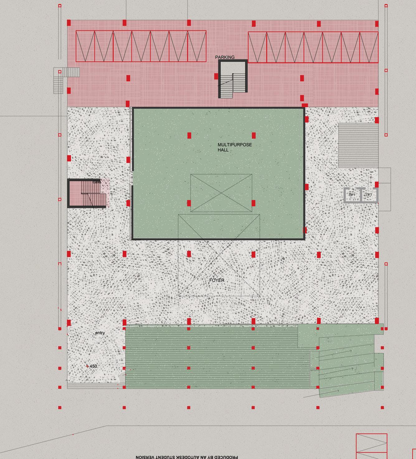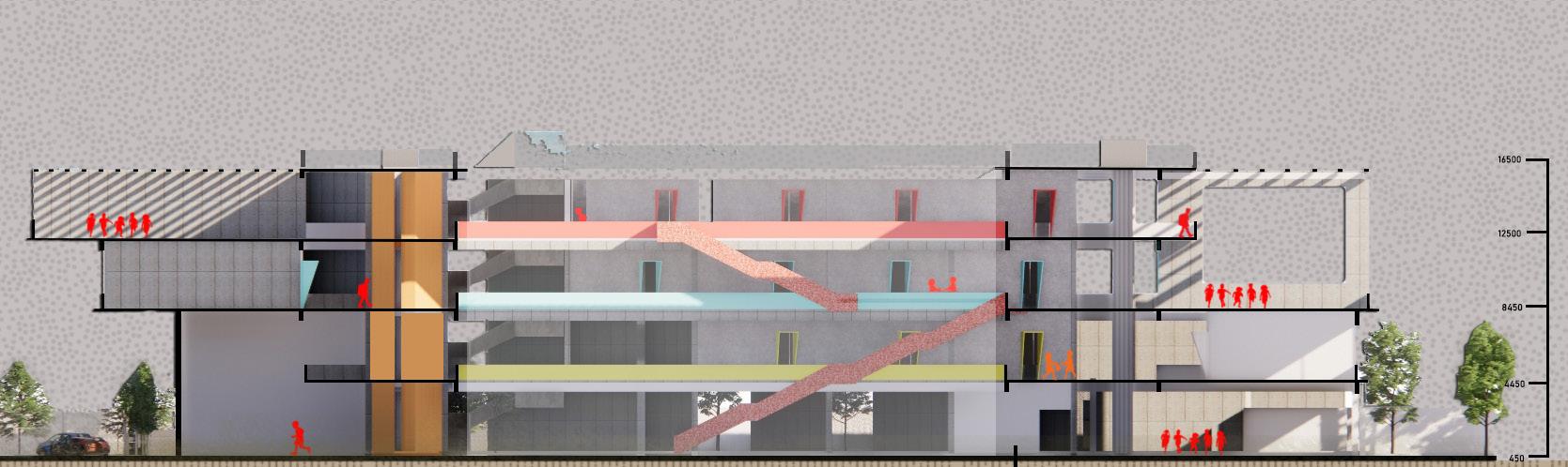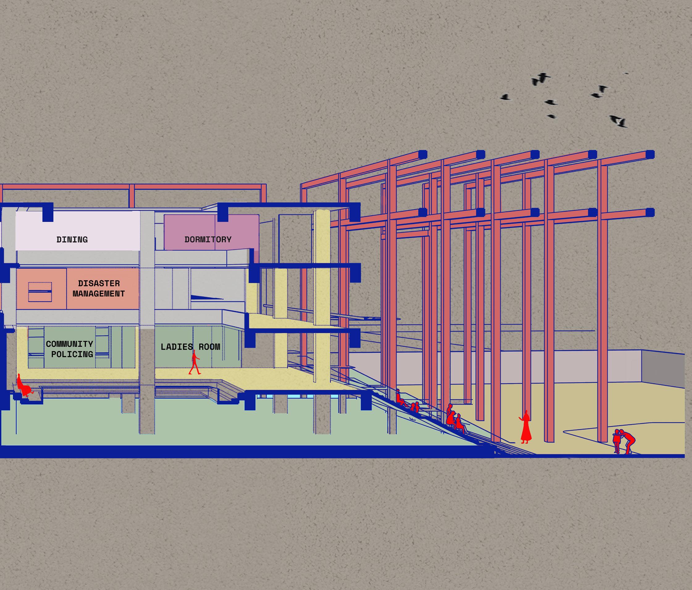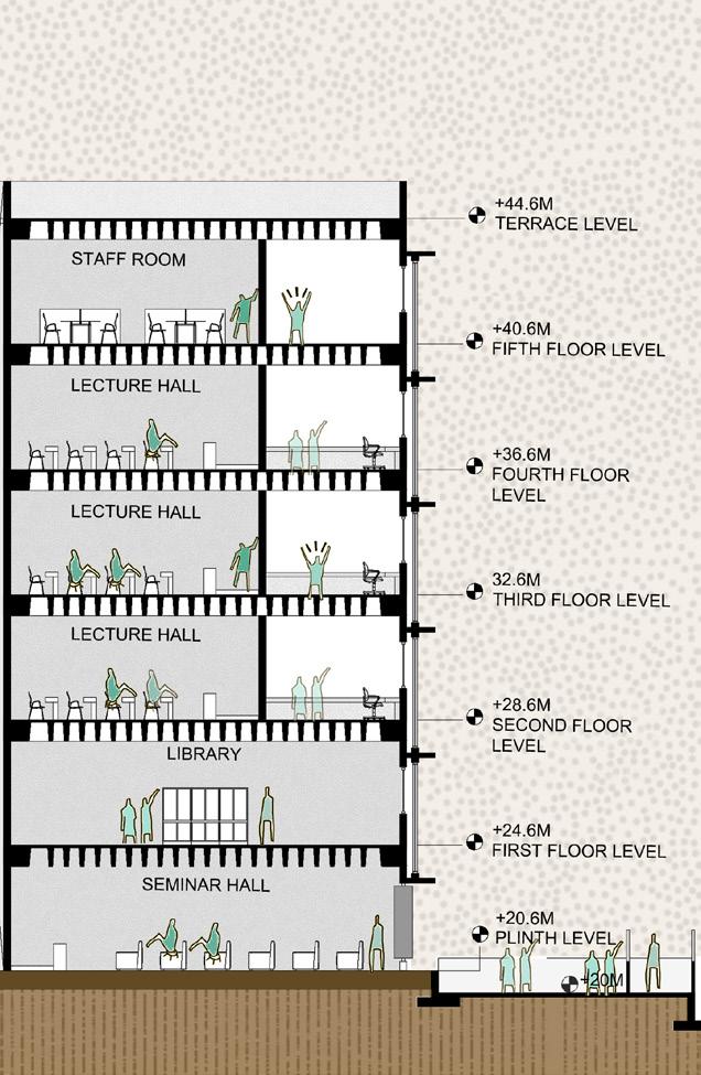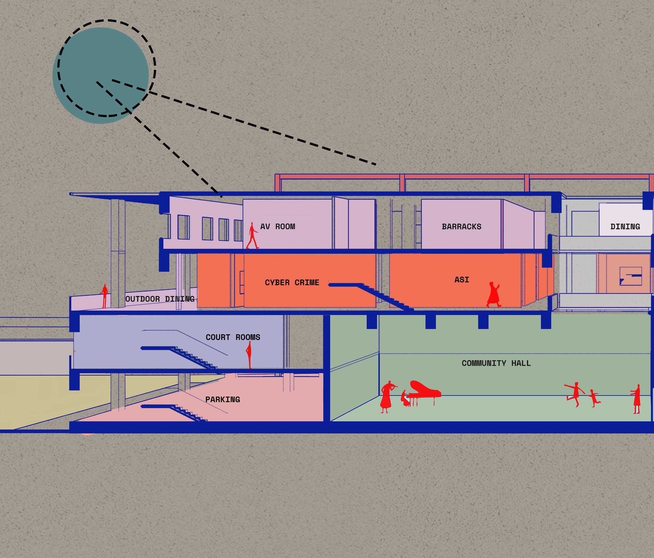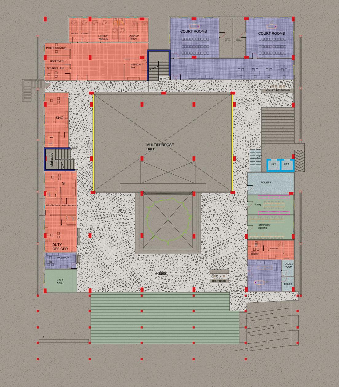 THE POLICE PLAY A VITAL ROLE IN A CITY’S LIFE AND ARE A SYMBOL OF STRENGTH AND PROTECTION. THE DESIGN OF THE LAW ENFORCEMENT CENTER IS IN SUCH A WAY THAT THE FRAMES AT THE ENTRANCE PROTECT THE PEOPLE INSIDE THE CENTER AND ALSO ACTS AS A RESPONSE TO THE CLIMATE OF THE SITE, CREATING FRAMES FOR JALIS WHICH CREATE A COOL MICRO CLMATE INSIDE THE STRUCTURE. THE ENTRANCE HAS STAIRS WHICH BECOMES A SPACE FOR THE PUBLIC,AN ICON TO SIT AND INTERACT INSPIRED BY THE ICONIC LIBRARIES OF MUMBAI.