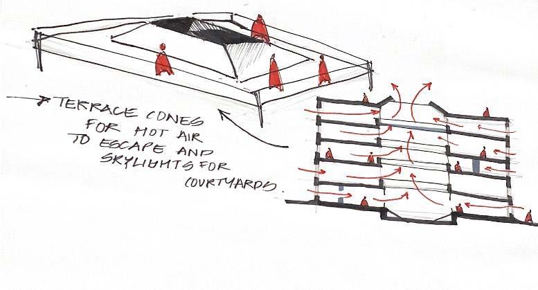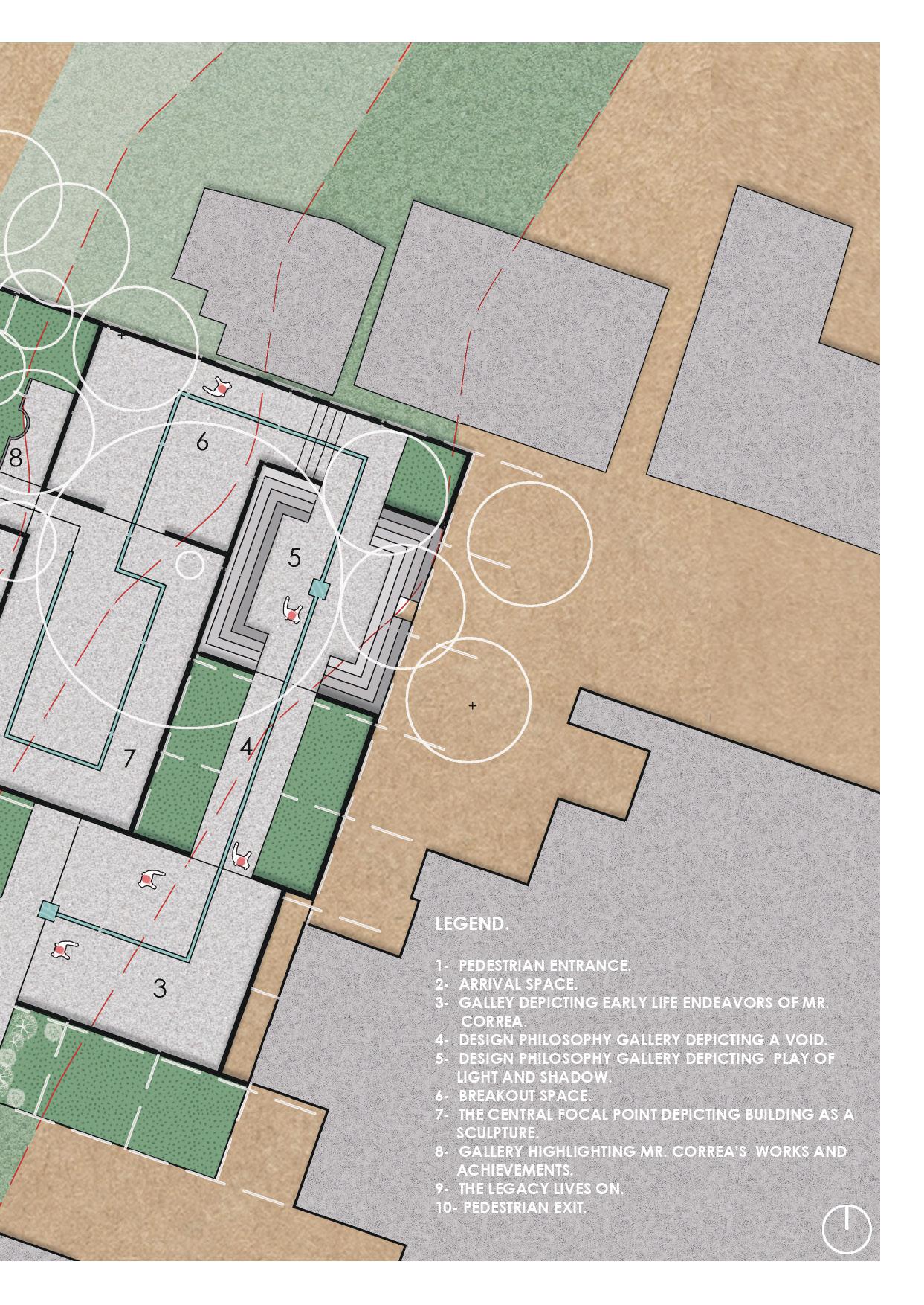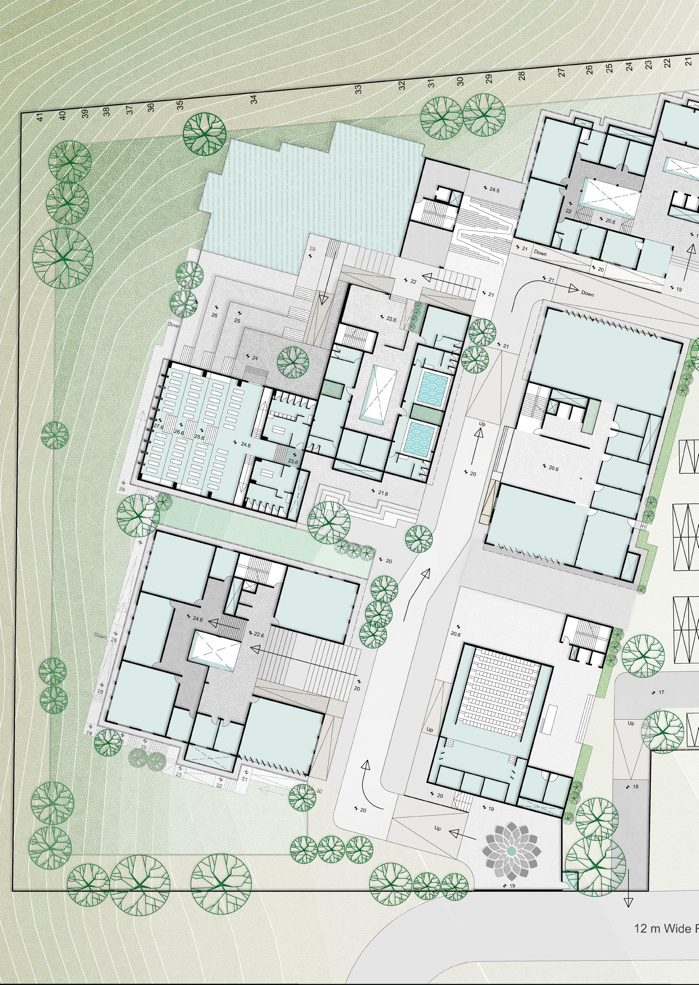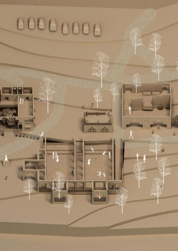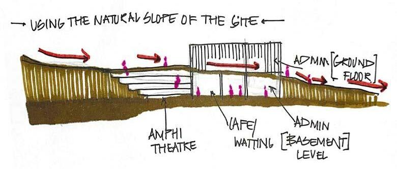 The Architectural Vision is planned as a sustainable model, focusing strongly on the connect of man in the realm of nature. The main block disappears into the earth and is half submerged to connect to the isolating quality of the earth, with the light and air movement planned from a series of sunken courts.