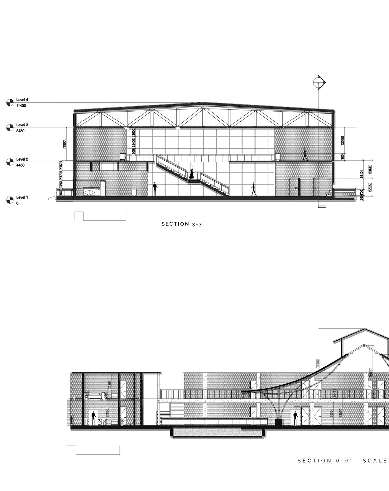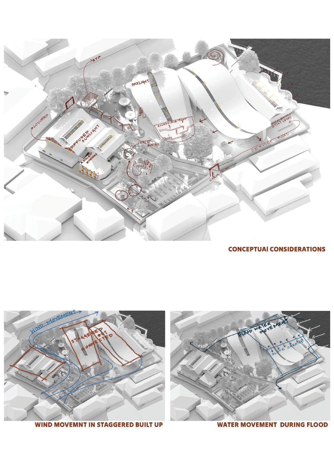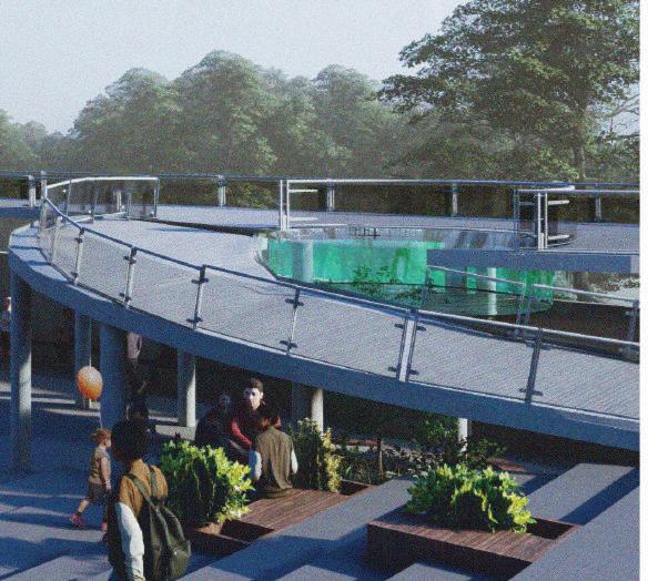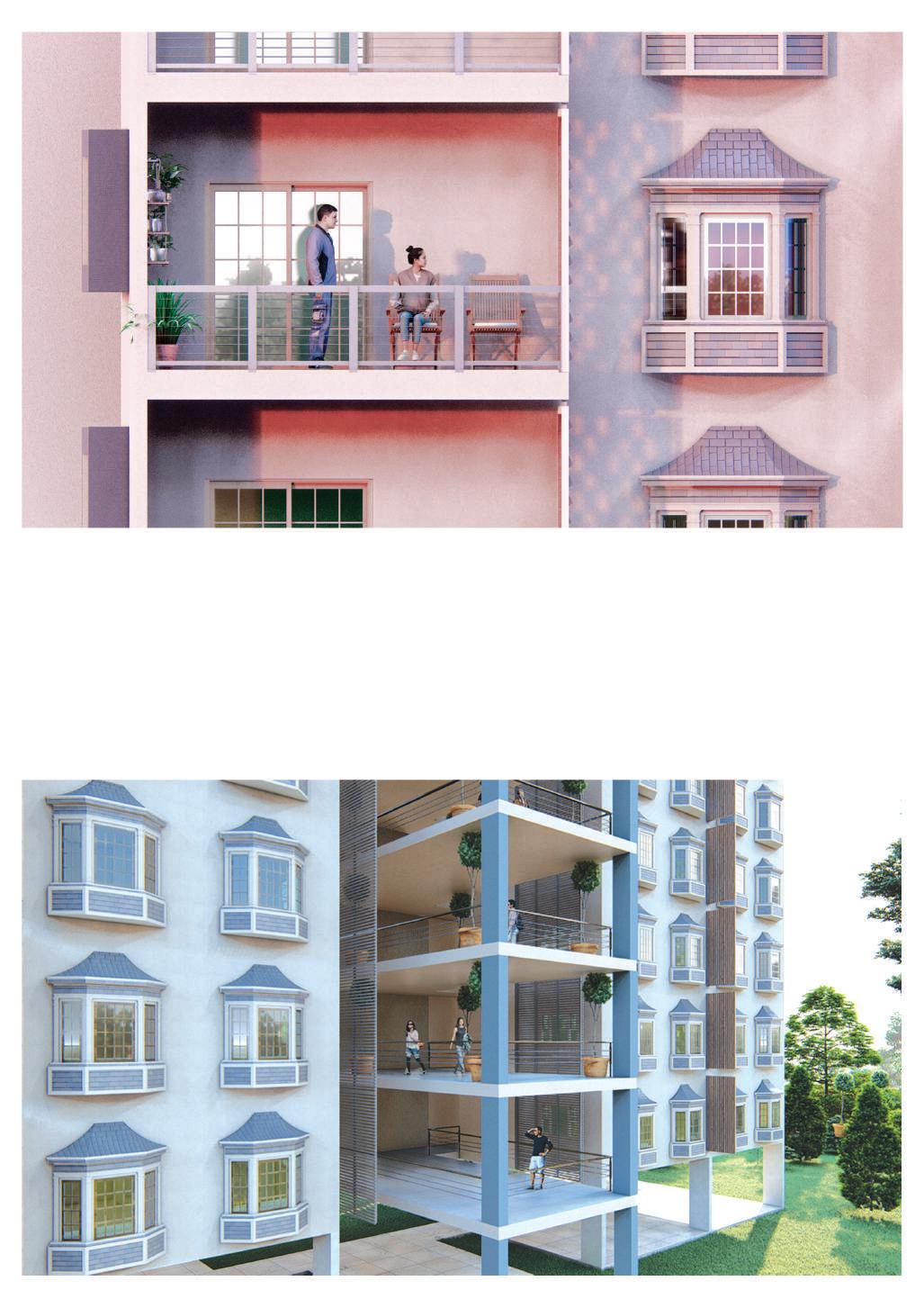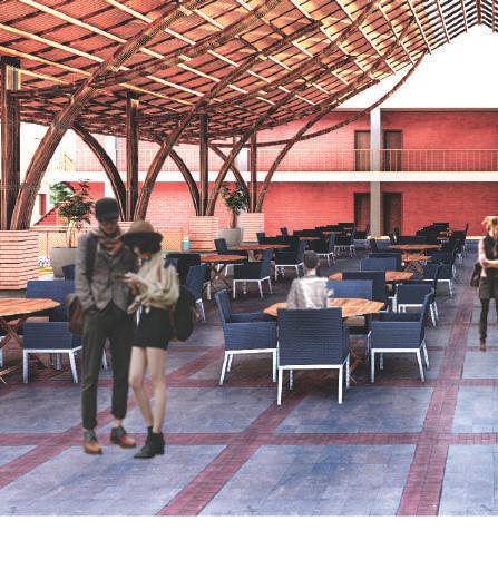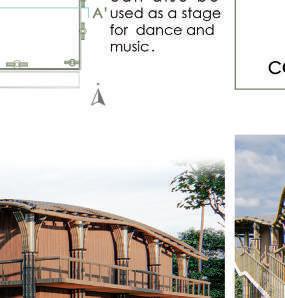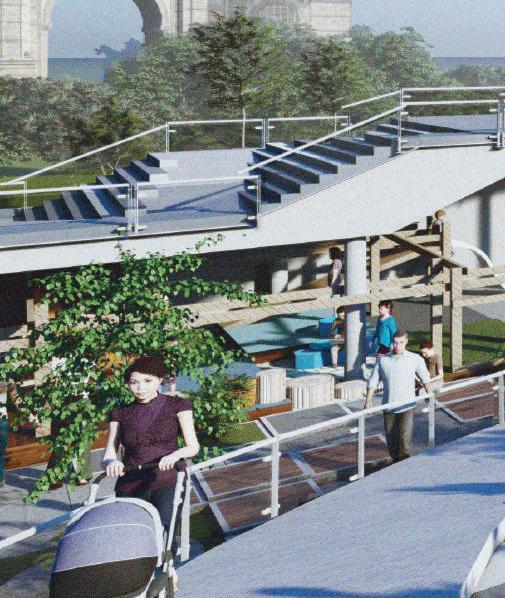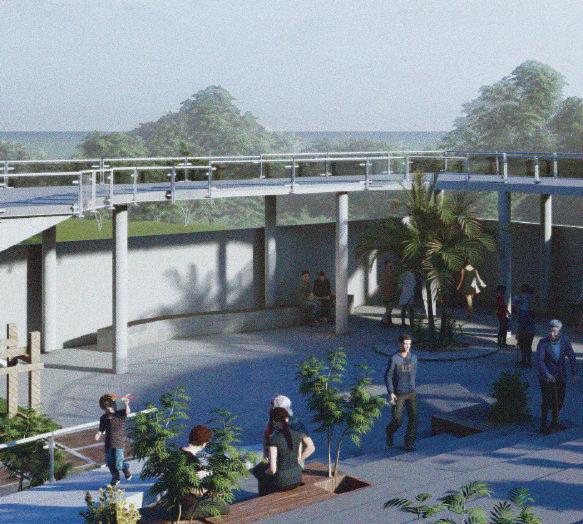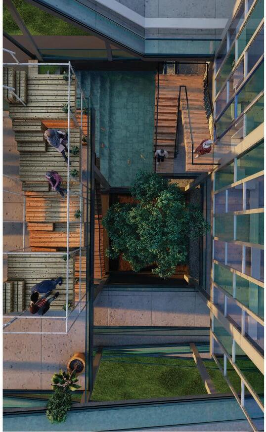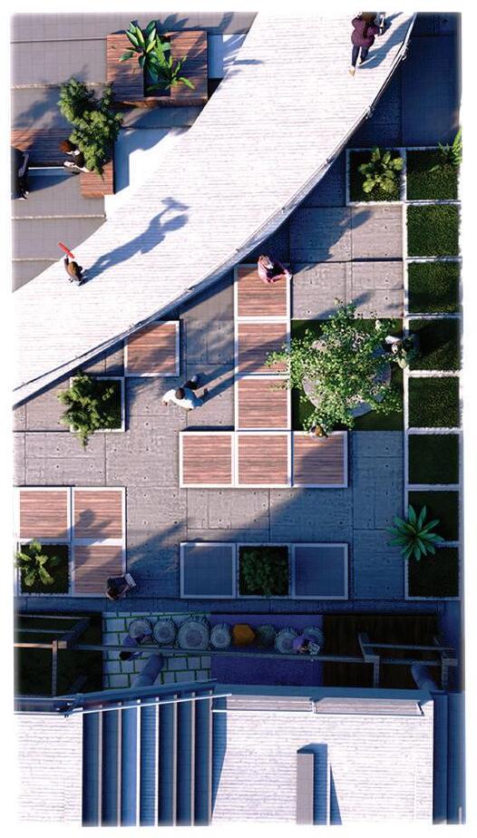 This spine is deliberately designed with various elevational points along its course, offering dynamic visual and physical experiences. These different levels serve as access points, providing a dynamic landscape that can be explored. Additionally, the varying elevations make it accessible to everyone, including individuals with disabilities, thanks to its sloping design that acts as an inclusive ramp. Along this central spine, the design approach involves placing studio apartments on the left side. This placement is deliberate, as it offers a balanced and comfortable living experience for residents.