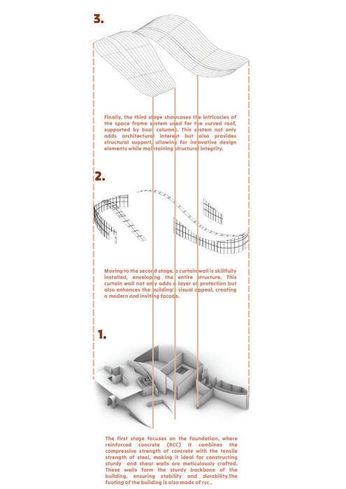 Horizon, an architectural and arts college, showcases an innovative design using parametric techniques. The buildings’ elevations are thoughtfully crafted to blend harmoniously with the mountainous backdrop of the site, creating a visually stunning integration with nature. The contours of the site play a pivotal role in shaping a fluid and dynamic design, which not only enhances aesthetic appeal but also captures the interest and curiosity of visitors. This design philosophy reflects a commitment to creating an environment that is both engaging and inspiring.