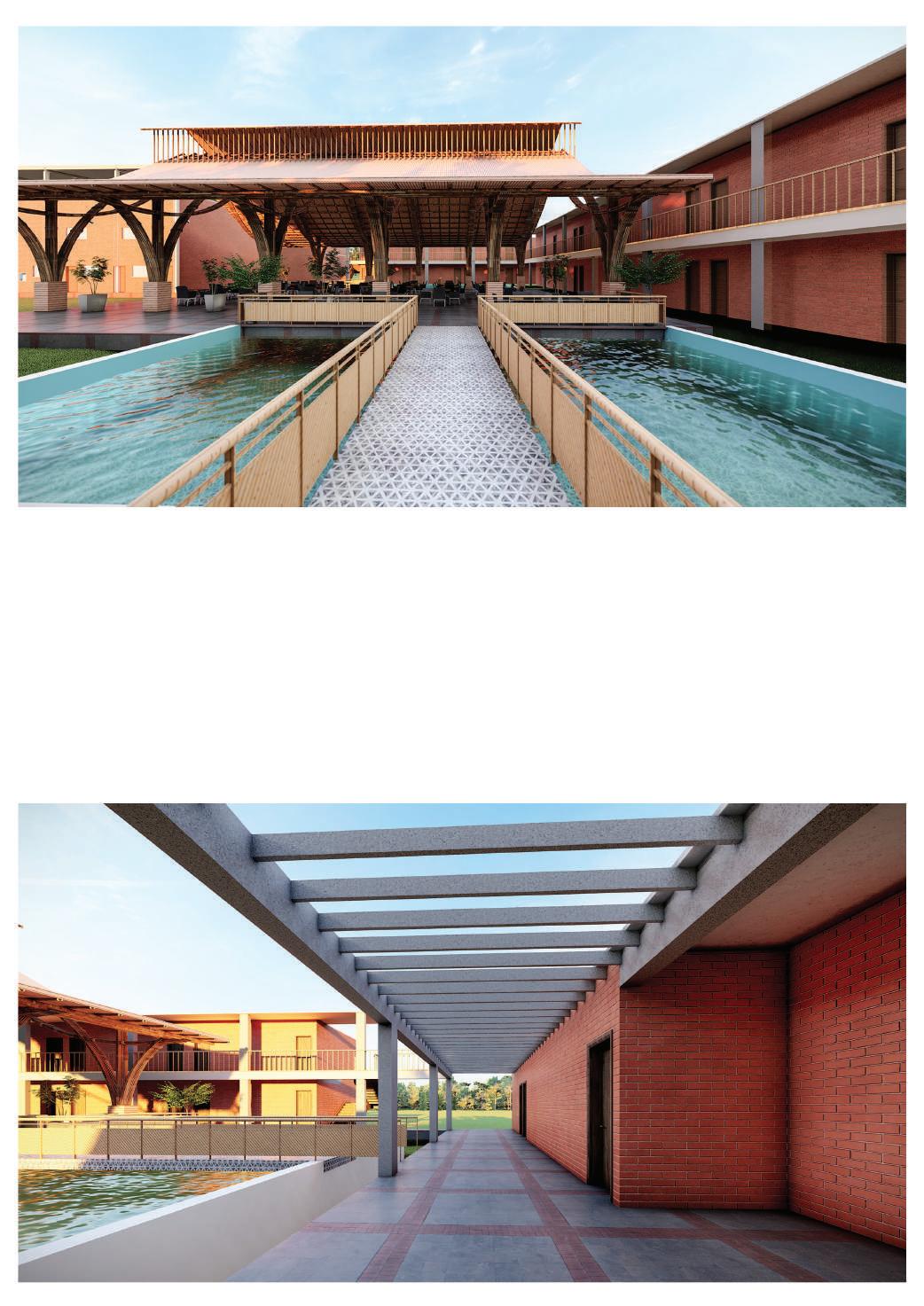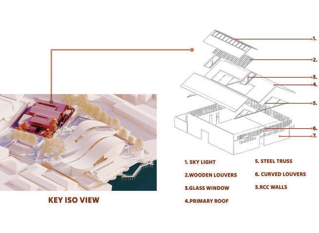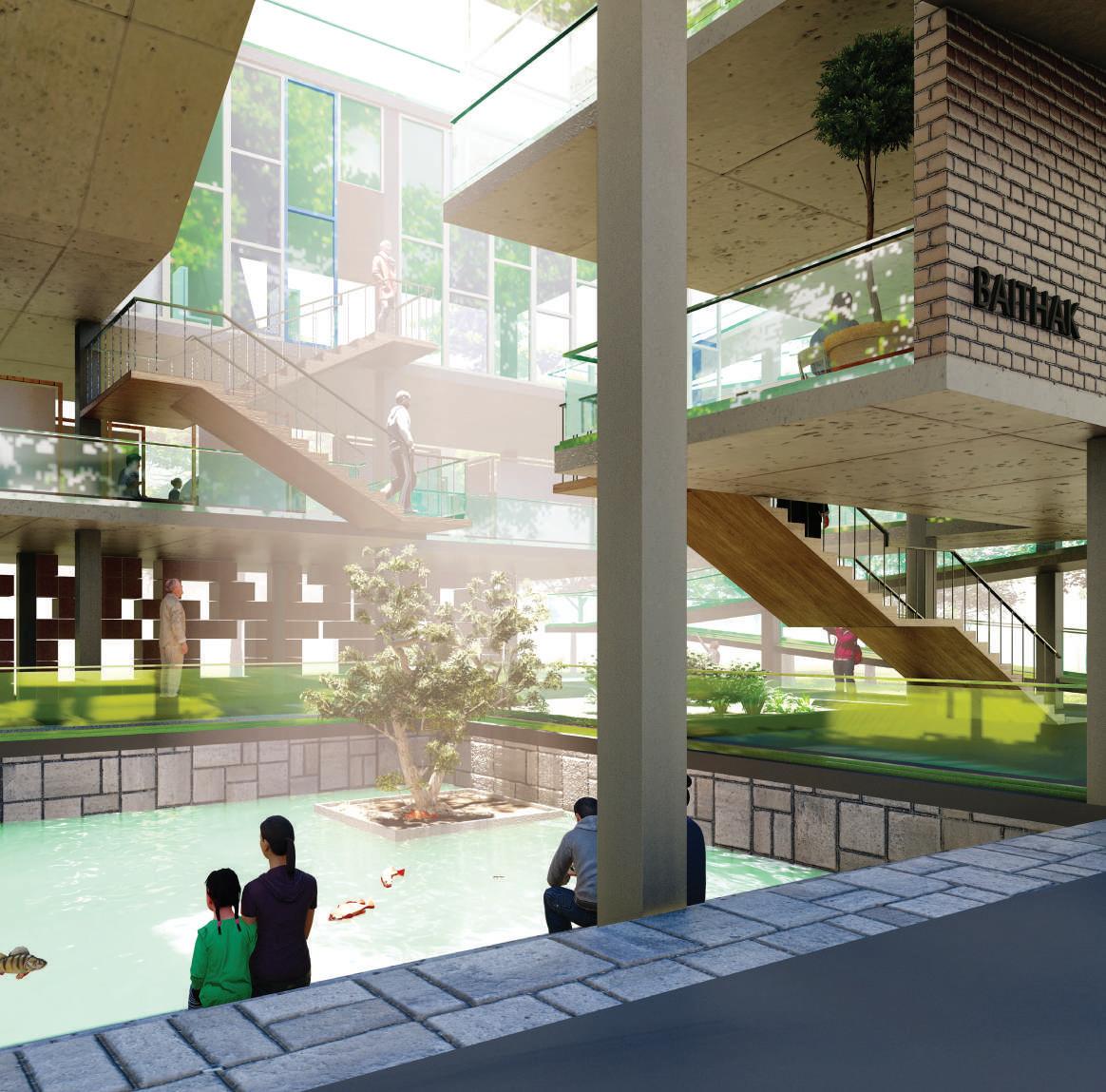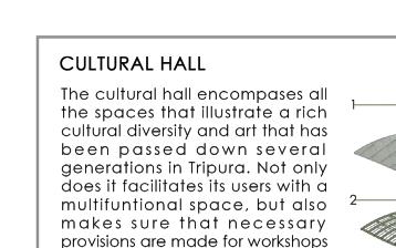 Provision of a space that creates an interactive environment between different people of all age groups, occupations and mindsets. Provision of well-planned, flexible spaces for students use of locally available material in the design. Encouraging the local artisans, hand-woven Khadi cloth has been inculcated in our structure. Universal design with accessiibility to all floors through stairs as well as ramps.