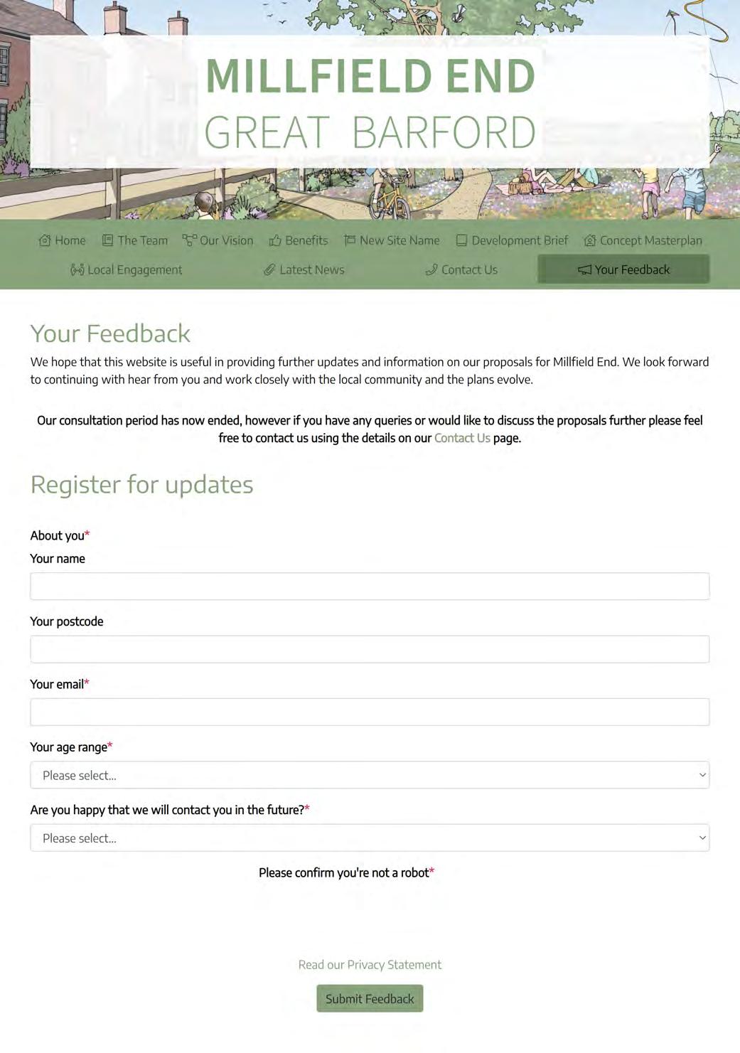The project team have engaged extensively with the local community of Great Barford to propose a development at Millfield End that reflects and complements the surrounding area, and responds to the desires of the local community. A range of methods have been used to communicate with the local community and local politicians, which has ensured that a collaborative approach has been taken in drafting this Development Brief and Design Code.