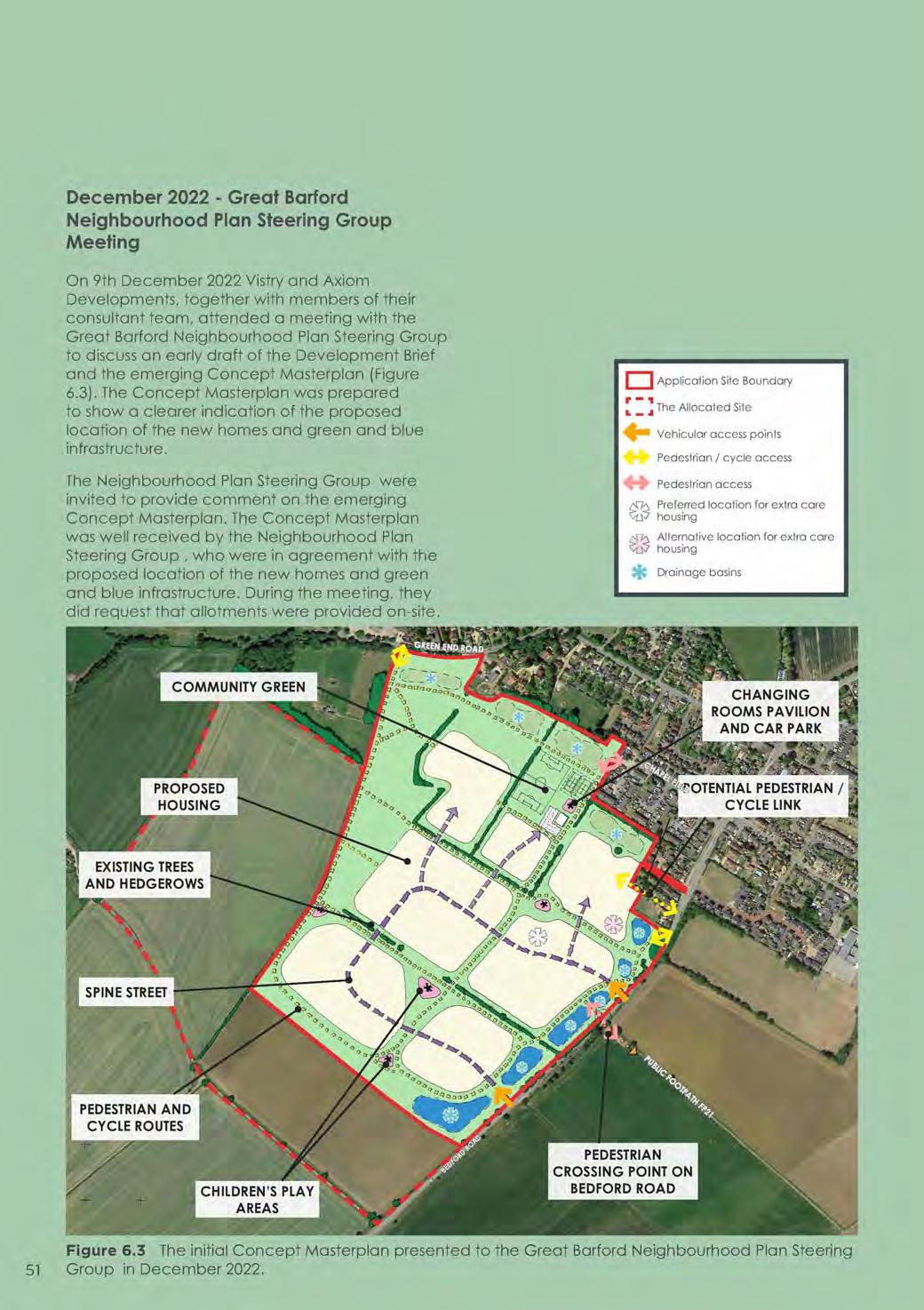 On 9th December 2022 Vistry and Axiom Developments attended a meeting with the Great Barford Neighbourhood Plan Steering Group to discuss an early draft of the Development Brief and the emerging Concept Masterplan. The Concept Masterplan was well received and the Parish Council Steering Group agreed with the proposed location of the new homes, green and blue infrastructure and positioning of allotments.