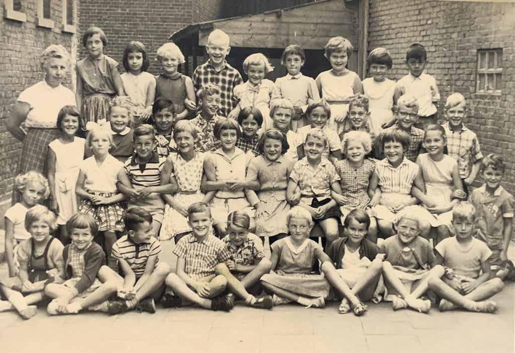 Klas 2 met juf Plet links en Ritsko rechtsboven. De foto is genomen achter de Willem Lodewijkschool naast het pand van banketbakker Theo de Jong, waar nu maaltijdenwinkel Smakelijk haar terras heeft.