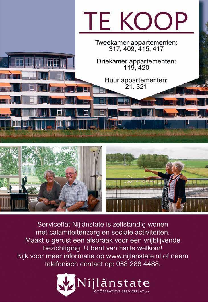 04 SENIORENkrant Boarnsterhim Statebiedthoogwaardige zorg enservice aanouderenalsthuis wonennietmeergaat. 15ruimeappartementenen 4zorghotelkamers verzekerdvan24-uurs zorg opeenprachtiglandelijkgelegenlocatie Zorg opmaatineenhuiselijkeomgeving Heeftuinteresseombijons te komen wonen? Neemdan contactmetonsop vooreenpersoonlijkgesprek. +31(0)566631294 | www.boarnsterhimstate.nl info@boarnsterhimstate.nl WonenmetzorginAldeboarn BOARNSTERHIM ST AT E Stationsweg 1 | 9001 ED Grou 0566 - 60 14 04 | www.notarismirjam.nl Gespecialiseerd in familie- en erfrecht, mediation en estateplanning Alexanderstraat 12, Sneek www.pheifer.nl 0515 41 58 25 Ervaar nu bij Autobedrijf Pheifer: DE BROMMOBIEL Wij zijn naast uw specialist in auto’s nu ook uw adres voor Ligier en Microcar brommobielen! Microcar M.Go Vanaf € 10.990,- Vanaf € 9.995,Vanaf € 15.485,- Vanaf € 18.490,• De voordelen van een brommobiel? • Geen wegenbelasting • Rijden vanaf 16 jaar Laag brandstofverbruik De ideale stadsauto. Klein en compact. Verkrijgbaar met onder andere stuurbekrachtiging, airco, achteruitrijcamera en Apple Carplay. Verleidend sportief. De Ligier JS50 is de meest sportieve brommobiel die er is. Stijlvol afgewerkt en boordevol luxe. De SUV met stijl. Een premium SUV met stijlvolle afwerking. Alle ruimte en toch compact. Voorzien van een prachtig interieur én exterieur. De allround SUV. Praktisch en comfort. De M.Go is de grote broer van de Dué en staat bekend om haar grote ruimte en hoge instap. PRIVATE LEASE MOGELIJK