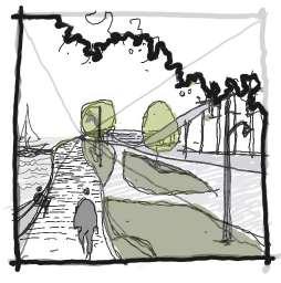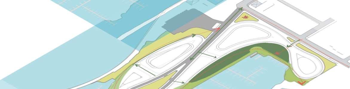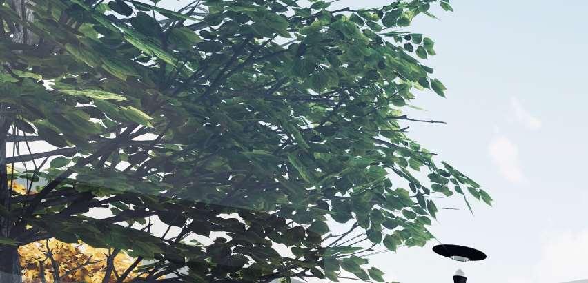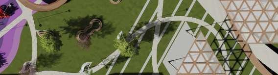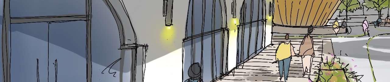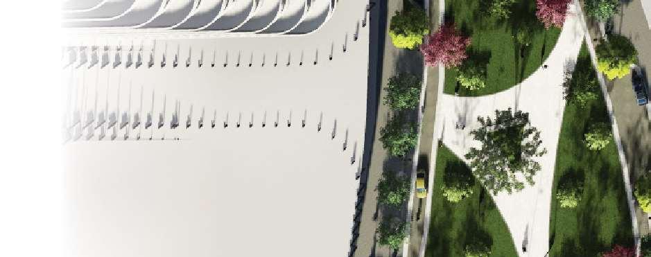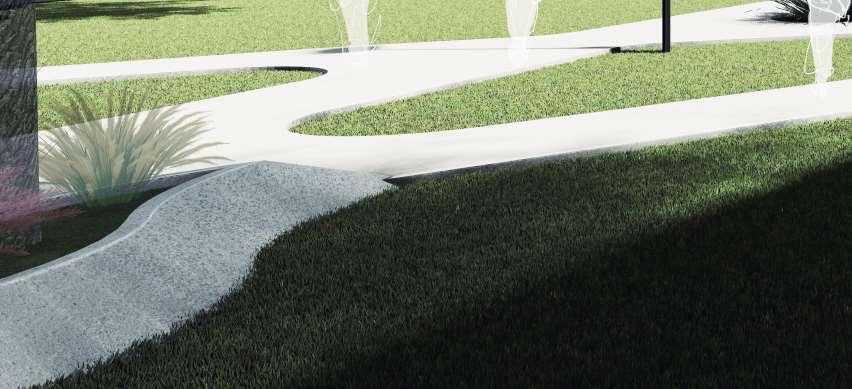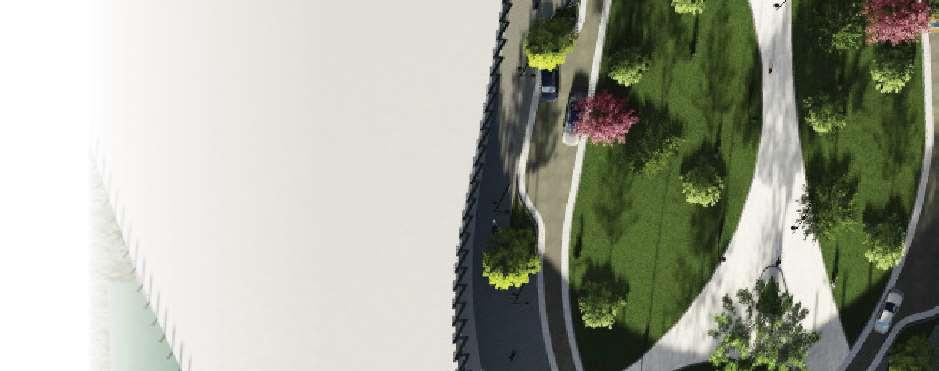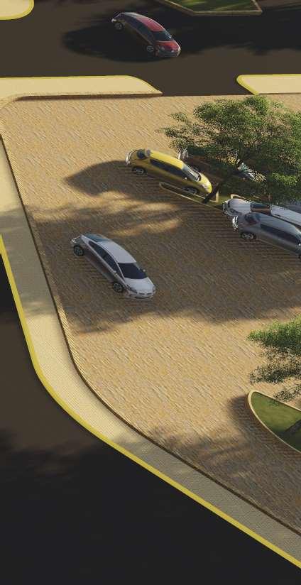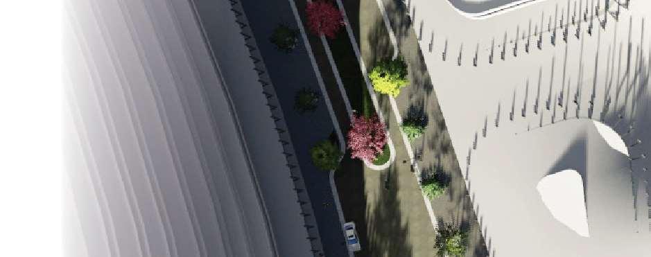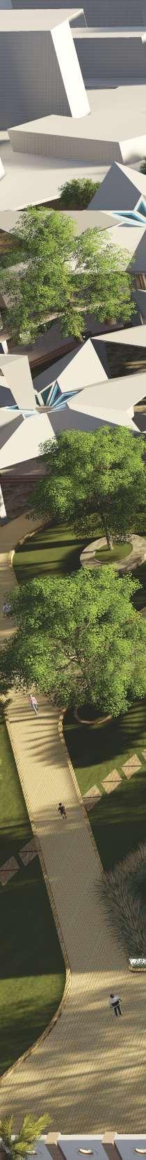 The streetscape design prioritizes pedestrian ßow and walkability, achieved through wider sidewalks and cobblestone driveways that slow down vehicles while adding character. The area includes designated pick-up and drop-off points for easy access, along with urban furniture and streetlights for safety and comfort. Native vegetation brings seasonal colors, blending with the environment. Shared streets accommodate pedestrians, cyclists, and vehicles for a safer experience. Commercial spaces with clear glazing offer captivating views, enhancing the ambiance. The public area focuses on a vibrant, cohesive community with a canopy merging into the plaza, featuring stepped seating for panoramic skyline views. The roof and waterbody integration mirror the natural setting. A continuous wave-patterned deck along the shoreline provides seating and safety, alongside a lake trail. The entrance, covered with trees, leads to a sculpture and greener plaza. Water features echo waves, enhancing nearby restaurants and stores. Planned vegetation ensures clear views of the surroundings, merging with the built environment.