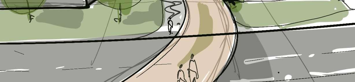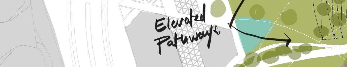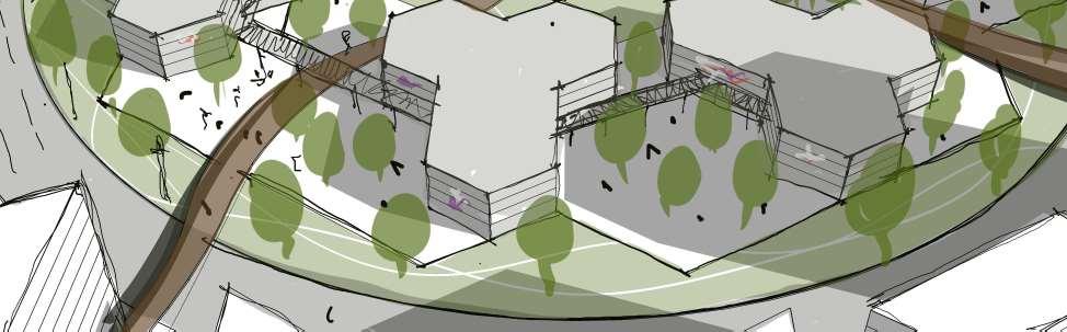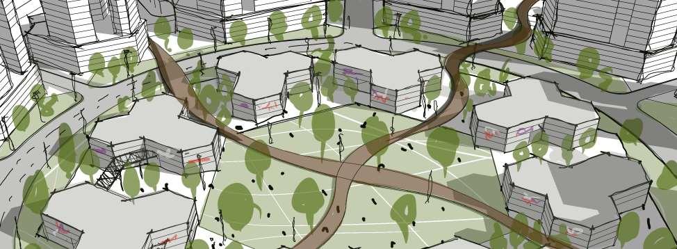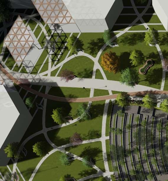 The design vision aims to create a walkable and interconnected urban environment that prioritizes user friendliness. The street network serves as the main spine, connecting the entire area. The pedestrian network enhances connectivity through elevated walkways that link three primary nodes. The central plaza serves as a focal point and gathering space,reßecting the signiÞcance of Erin Mills Town Centre as a major retail hub Mixed use developments surround the plaza, integrating commercial, ofÞce, and residential spaces. This design promotes a vibrant and diverse urban environment that facilitates living, working, and socializing in close proximity To connect with the existing neighborhood and promote holistic urban growth, townhouses and community spaces form an outer ring These elements establish a seamless link between the new development and the surrounding areas while encouraging social interaction among residents.