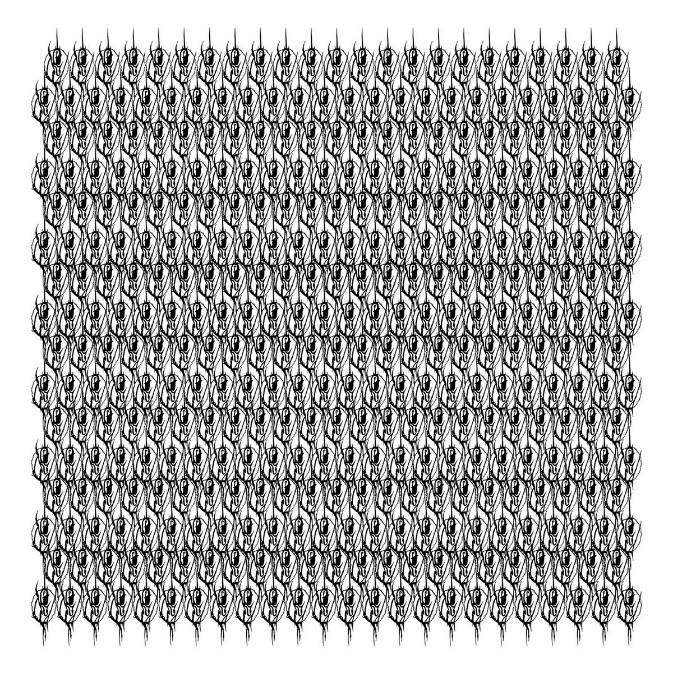At that very instant, a swarm of darting tentacles emerges from the lowest point of the canvas, resembling earth-born serpents. The soldiers stumble and fall, raising screams of terror to the sky. Before crashing into the sand, a young woman pirouettes upon herself and drops her rifle. At that moment, she looks straight at the Convention, as if she were staring at the center of a target, her jaw clenched, her eyes wide open as if she had just awakened from a bad dream. The tentacle that has tightened around her ankle rises quickly up her armor, wraps around her torso, covering her mouth. Now, everyone can see that it is a root: a green-brown stem, as thick as a human leg.