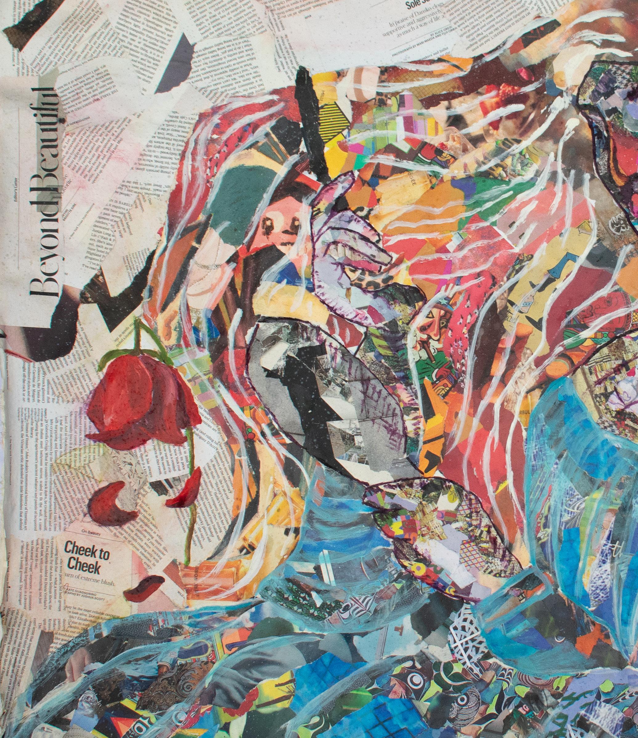 Falere’s inspiration stems from a deep interest in heritage conservation and the marks people leave behind. “I find beauty in decay and in the tension between natural and built forms,” she shares. Abandoned buildings, city edges, and historic artifacts often ignite her imagination. Additionally, she finds herself drawn to the glossy surfaces of lifestyle magazines and aspirational imagery—symbols of vanity and desire that contrast sharply with the flawed environments she studies. “I’m fascinated by how we present ourselves versus what we leave behind, and even how our built environment can shape our perception of ourselves” she explains. “I’m