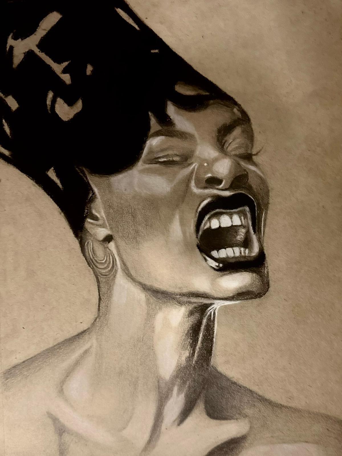 Anaya’s artistic voice is deeply rooted in her experiences as a young Black woman navigating a world that often seeks to silence her. She started her career as a sketch artist, working primarily with dry mediums such as graphite and charcoal. These materials, she explains, “give a dramatic effect to the work and allow me to loosely express my ideas.”