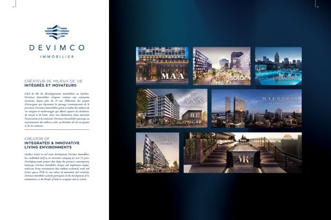 CREATOR OF INTEGRATED & INNOVATIVE LIVING ENVIRONMENTS Quebec’s leader in real estate development, Devimco Immobilier, has established itself as an innovative company for over 25 years. Developing major projects that shape the province’s contemporary landscape, Devimco Immobilier designs and implements unique, multi-use living environments that combine residential, work and leisure spaces. With its core values of innovation and creativity, Devimco Immobilier actively participates in the development of its communities, to the benefit of both its occupants and its visitors.