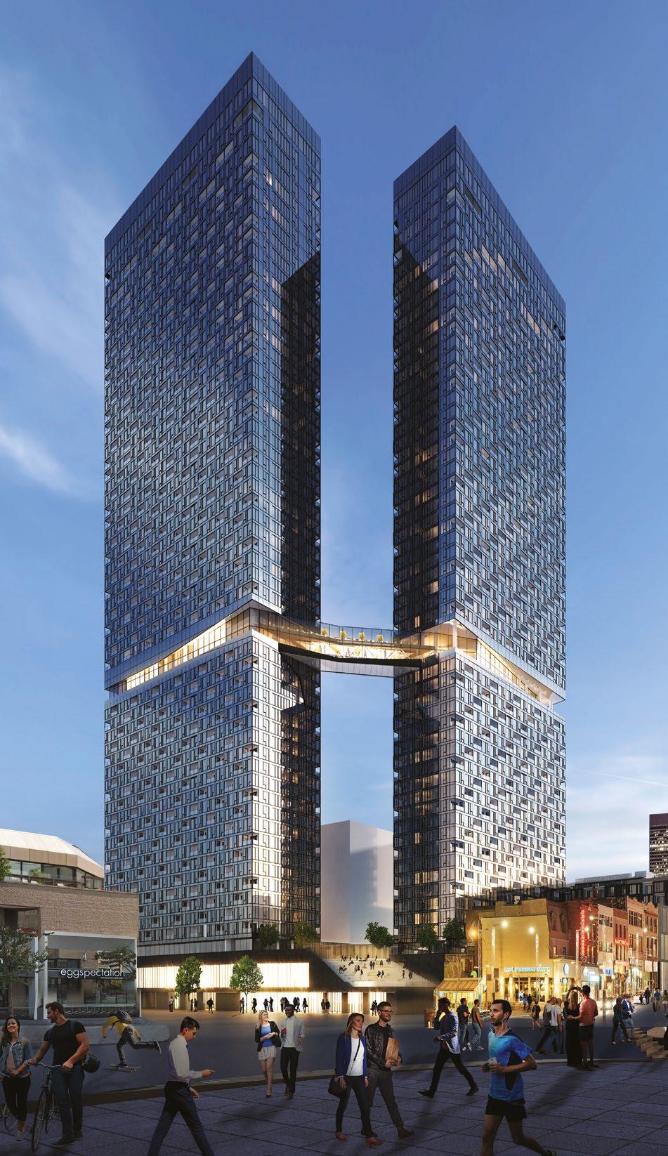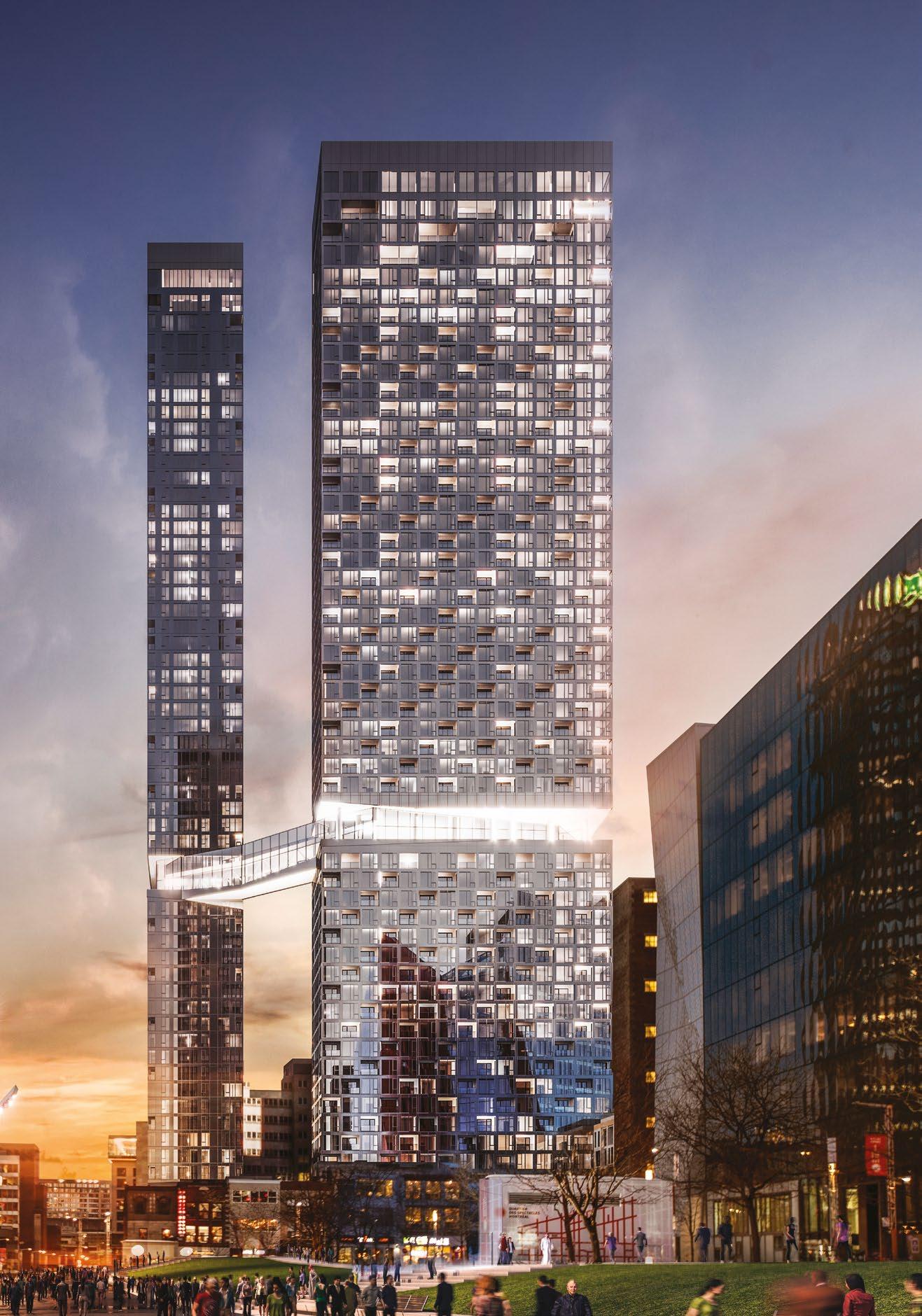 Atteignez des sommets de raffinement dans ces prestigieuses tours de 58 et 61 étages surplombant la place des Festivals et l'esplanade de la Place des Arts. Reliées par une saisissante passerelle aérienne, elles s'imposent comme les plus hautes jamais réalisées à Montréal dans le cadre d’un projet résidentiel.