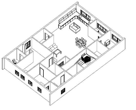 Dining room with seating for six Living room with seating for six Home office for Maria and two other employees with laptops.