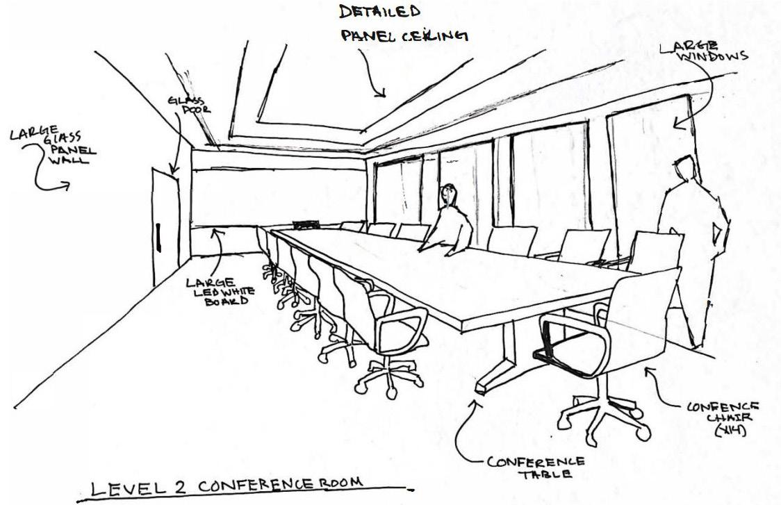 The design layout for level two was to create as much open space as possible. Collaboration and teamwork was the first thing that came to mind when inserting the concept “exploration” into the design layout. All of the spaces on this level needed to be accessible to everyone very easily and the conference room and main collaboration areas were key areas that were meant to be large gathering spaces.