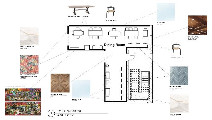 Left: Level One Two Plan Right Bottom: Level Two Conference Room Elevation, Sketch and Photos of FF&E