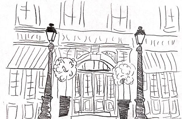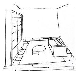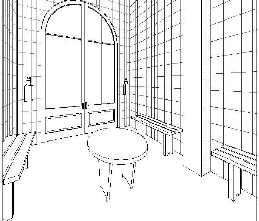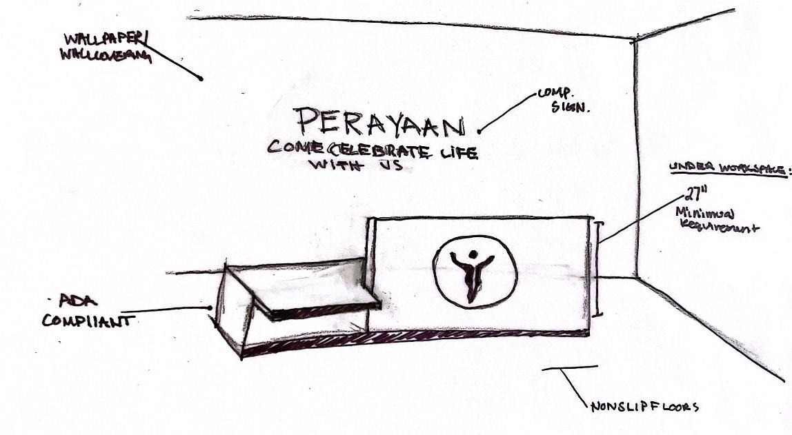Bottom Left: Shows a free-hand perspective sketch of the reception area.