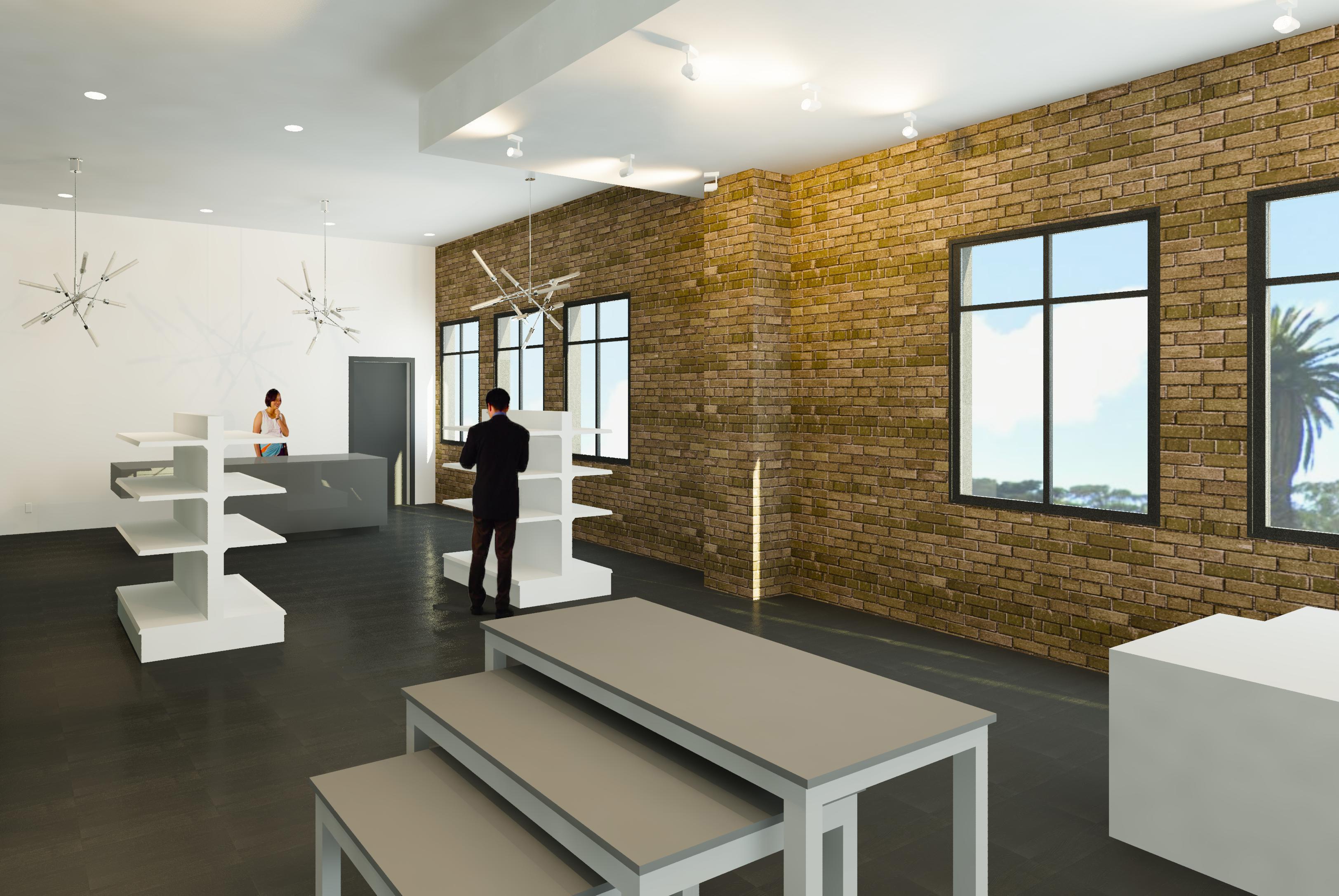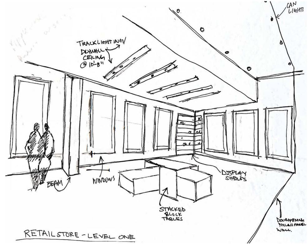 store Top Row-Left to Right: Level One Reception Elevation, Rendering, Sketch, and FF&E Bottom Row- Left to Right: Level One Retail Elevation, Sketch and FF&E