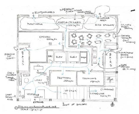 The design layout for level one was created for an all around immersive experience for guests from the time they walk into the building to the time they walk out the doors. The large, accessible, open floor plan with windows streamlining the perimeter of the building and glass panel walls on the cafe and retail fronts give maximum lighting and achive the best environment for guest.