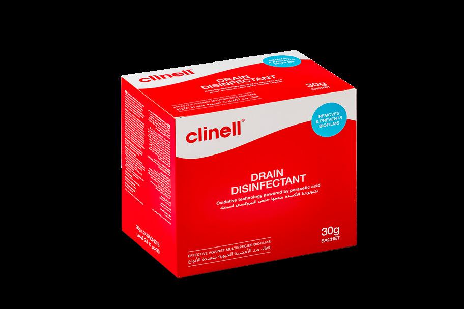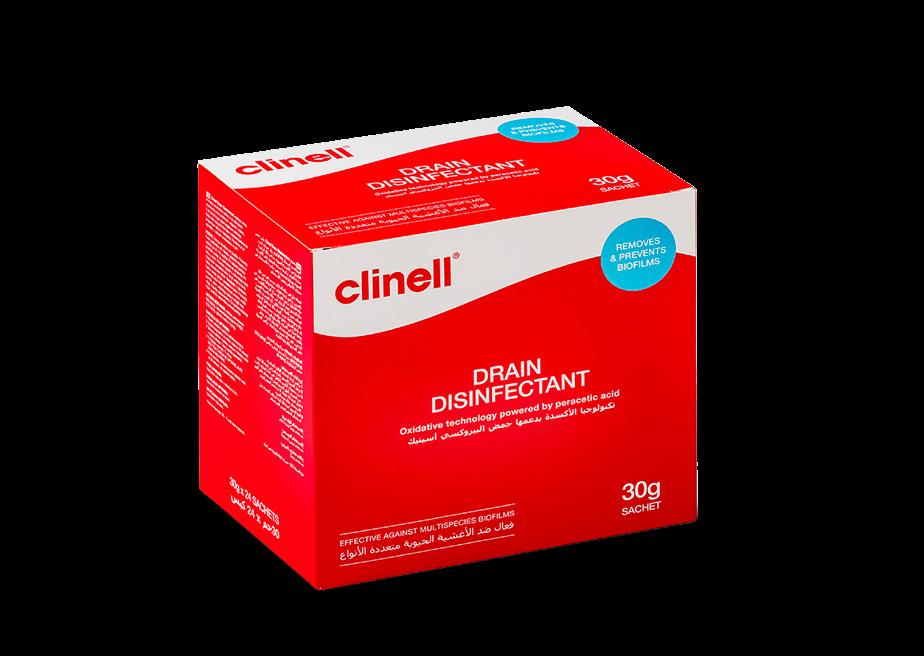 Clinell Drain Disinfectant® elimineert biofilm en de micro-organismen die het bevat, en verhindert de hergroei ervan. Eén zakje Clinell Drain Disinfectant produceert in combinatie met water voldoende oxiderende stoffen, waaronder perazijnzuur, om de structuur van biofilms af te breken.