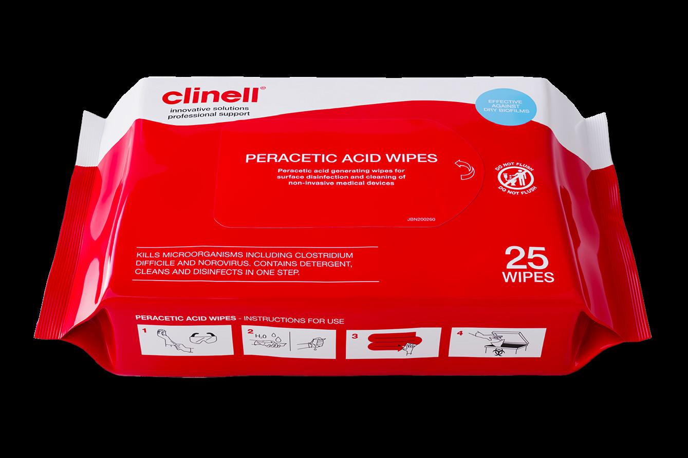 Humphreys en medewerkers15 stelden vast dat de werking van op perazijnzuur gebaseerde desinfectantia (zoals Clinell Drain Disinfectant) tegen bacteriën en sporen gelijkwaardig of meer doeltreffend zijn dan chloorderivaten, zeker bij organische bevuiling of bij besmetting van droge oppervlakken.