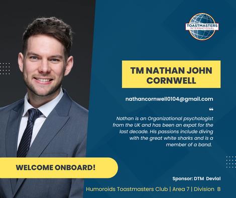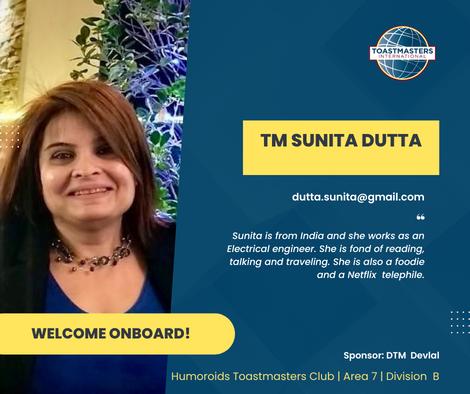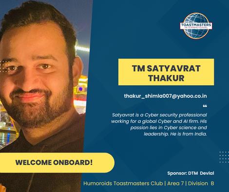 HeisaToastmastersince 2006andistheFounder PresidentofHumoroids.Heis aformerDivisionDirector, PathwaysAmbassador, DistrictLeadershipChairand DTACEducationChair HeworksasHeadoflearning foranMNCandisaCertified Trainer Devlalisfondof toons,cats,outdoors,MMA andtheatre.