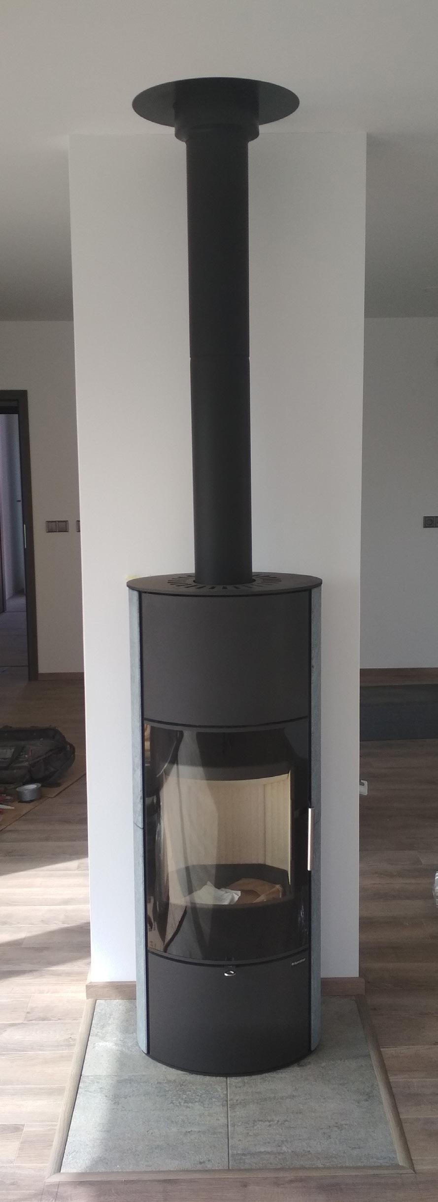 Ve standardním provedení dodáváme komín se svislým kouřovodem se založením na stropní konstrukci. Tato varianta nám pomůže uspořit podlahovou plochu i několika m2. Nadstřešní část a podstropní část komína lze lakovat do jakéhokoli odstínu RAL.