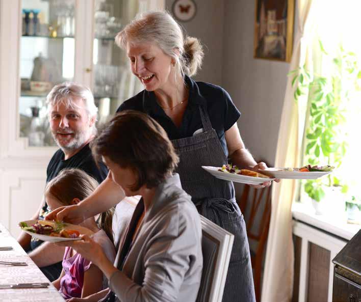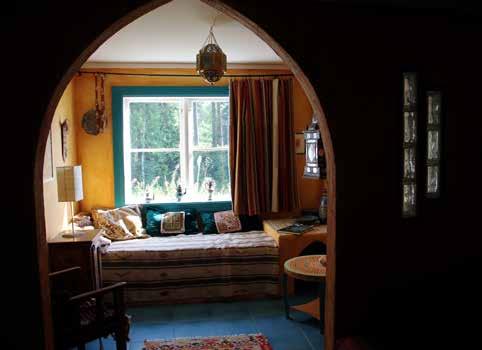 EFTER LUNCHEN tittar vi oss omkring i det gemytliga hotellet. Här finns matsal, konferensrum och bibliotek, och alla rum har inretts med konstföremål, textilier och möbler från ägarparets resor. Det är ett slags “världshus”, berättar Sarah, och vi möter också olika kulturer i vart och ett av de nio sovrummen: Indien, Marocko, Japan, Venedig, Afrika eller England. Dessutom finns en munkcell, ett bonderum, ett samiskt och ett gustavianskt inspirerat rum. Vi väljer att bo i det indiska rummet, ombonat med guldkantade textilier och dekorerade möbler i klara färger. Liksom matlagning har skapande varit