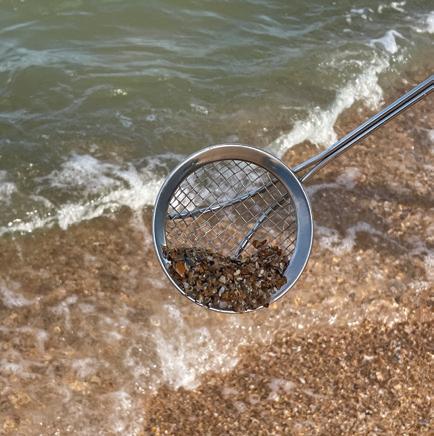 The best time to look for shark teeth is at low tide. To assist in my search, I used a strainer, which separated the shell matter and made it easier to see the teeth. Be aware that there are lots of imposters, particularly turtle shell pieces.