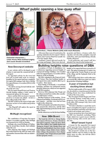 The first eight months of Devonport’s BID was described as a transition period, but the building blocks have been established for growth of the town centre. The Devonport Brand Project and Tourism Growth Strategy would help create a properous local economy for visitors and locals alike, BID manager Judy Grieve told the DBA AGM. “We believe that there is much that can be done to strengthen Devonport’s position as a visitor destination and better meet the needs of both local residents and visitors.” Various promotions have been held since the BID was launched, including White New DBA Board Night, which was a great success with DeThe board for 2015/16 is: Morag Burden vonport buzzing with crowds and events, (Devonport Flowers); Donna Gustafson she said. (Devonport Lingerie); Adam du Preez (Back Wharf tenant found Alley Tease Gallery); Ian Cunliffe (Barfoot and A tenant for the upgraded Devonport Thompson, Rotary); Judy Machin (Peace and Wharf space has been selected by council, Plenty Bed and Breakfast); Ken Davis (Archi- Devonport BID manager Judy Grieve said. tect); Pauline Colmar (Bette’s/Zest): Pauline The prospective tenant was in the hosBaker (Magic Broomsticks); Dave Barton pitality industry and was likely to take the (accountant); John Waugh (lawyer);and Eddie whole space on offer, she told the DBA’s de Heer (property owner). AGM on Monday.