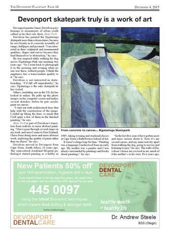 Devonport skatepark truly is a work of art Devonport painter James Davidson pays homage to monuments of urban youth culture in his first solo show, Skate Park. Davidson has painted the Ngataringa skatepark more than a dozen times, because he sees beauty in its concrete assembly of ramps, halfpipes and pyramid. “I am interested in their sculptural and monumental qualities, shapes and curves because they lend themselves to abstraction,” he says. He was inspired while walking his dog across Ngataringa Park one morning two years ago. “So I went back to photograph it in the morning and evening when no one was there, without people. I think the emptiness has a transcendent quality to it,” he says. Davidson is not interested in skateboarding. “I’d fall off immediately,” he says. Ngataringa is the only skatepark he has visited. Others, including one in the US, he has looked at online. He pulls up the photo images on his computer screen and makes several sketches, before he puts acrylic paint on canvas. “I start out with architectural lines that help with the construction of the image. I ended up liking the lines so much that I left quite a few of them in the finished painting,” he says. Skate Park is part of Davidson’s transition from realistic to more abstract painting. “I have gone through several stages in my work, and since I came to New Zealand, I have been doing more and more abstract work, exploring the quality of paint rather than an object,” he says. Davidson arrived in Devonport from Cape Town, South Africa, 14 years ago. The semi-retired Auckland Hospital pathologist started painting as a hobby in