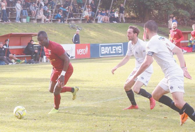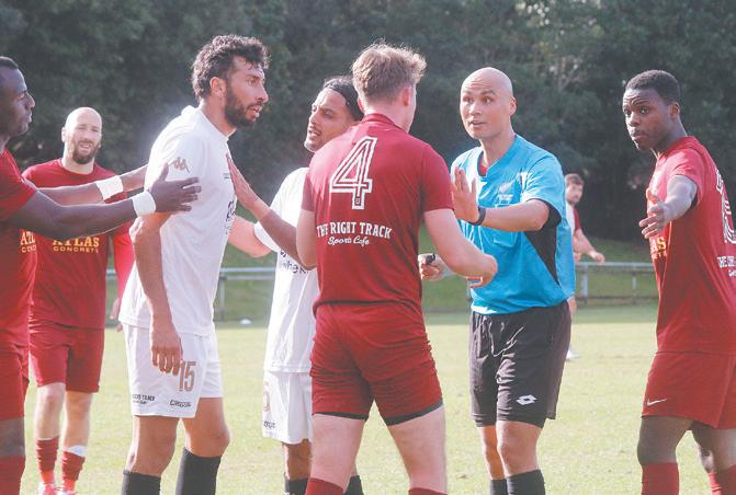Goalscorer… Jake Porter (below, right) who scored from the penalty spot for Shore, on attack. Meanwhile Waiheke’s fans were entertainers themselves (below). Lining up a shot… Shore’s Horace James (above) while referee Mazhar Batoor (below) had to calm players down as passions ran high