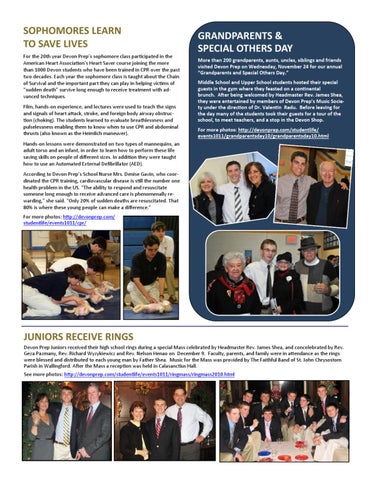 GRANDPARENTS & SPECIAL OTHERS DAY More than 200 grandparents, aunts, uncles, siblings and friends visited Devon Prep on Wednesday, November 24 for our annual “Grandparents and Special Others Day.” Middle School and Upper School students hosted their special guests in the gym where they feasted on a continental brunch. After being welcomed by Headmaster Rev. James Shea, they were entertained by members of Devon Prep’s Music Society under the direction of Dr. Valentin Radu. Before leaving for the day many of the students took their guests for a tour of the school, to meet teachers, and a stop in the Devon Shop. For more photos: http://devonprep.com/studentlife/ events1011/grandparentsday10/grandparentsday10.html