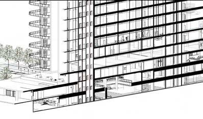 Mixed-Use Development. This structural feature is integral to the building's architectural identity, creating a striking visual statement while maximizing the functional use of space beneath. Cantilevered structures, like this one, enable expansive floor a eas to extend outward without the need for vertical support columns below, contributing to the innovative livework-play model of the development. This design element also enhances the building's dynamic form, offering both aesthetic appeal and practical urban solutions from the butterfly engineering