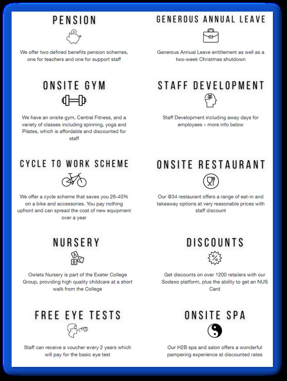We acknowledge our employees’ involvement in shaping futures and making a difference by offering amazing benefits and the opportunity to progress and grow in one of the most successful colleges in the South West.