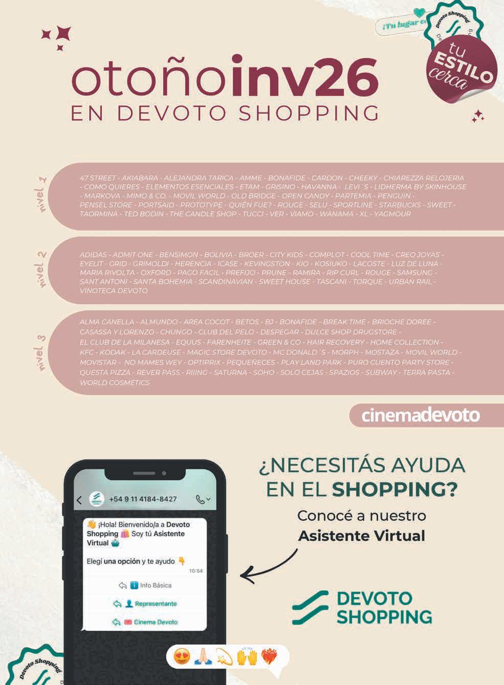 En el corazón de nuestro barrio, Devoto Shopping se consolida como el centro comercial más completo, transformándose de forma constante para que cada visita sea una experiencia única y placentera. Bajo la premisa de ofrecer siempre lo mejor, el shopping invita a los vecinos a descubrir un espacio donde la moda, el entretenimiento y la gastronomía convergen en un solo lugar. Con la llegada del frío, el centro comercial presenta su nueva colección Invierno 2026. Los locales se han renovado con las últimas tendencias, ofreciendo diseños exclusivos que combinan estilo y confort. Es el momento ideal para recorrer sus pasillos, conocer las propuestas de las marcas líderes y enamorarse de las texturas y colores que marcarán la temporada. Cine con Tecnología de Vanguardia Para los amantes del séptimo arte, Cinema Devoto sube la apuesta, disfrutar de los mejores estrenos con su tecnología láser, que garantiza una calidad de imagen superior y un sonido envolvente que te hará sentir parte de la acción. Una experiencia visual y auditiva. El patio de comidas completa la experiencia, ofreciendo el entorno perfecto para un descanso entre compras, y el infaltable espacio