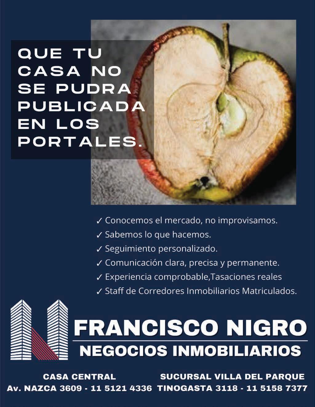 FRANCISCO NIGRO Martillero Público y Corredor Inmobiliario Tasador-Desarrollador Inmobiliario Matrícula CUCIBA N°8148 (Ciudad Autónoma de Buenos Aires) Matrícula CMCPDJLP N° 7692 (Provincia de Buenos Aires) L 11.5121.4336 www.francisconigro.com.ar francisco@francisconigro.com.ar
