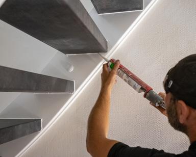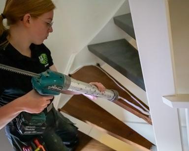 Vervolgens wordt de trap afgekit met siliconenkit. Dit zorgt ervoor dat er tijdens het schoonmaken van de trap geen water in de trede komt. Ook zorgt dit voor een strakke afwerking aan de zijkanten.