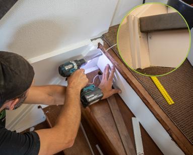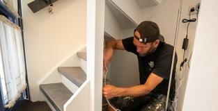 Nu is het tijd om de trap te bekleden. Elke keer wordt eerst het stootbord bevestigd. Daarna wordt de ledstrip midden onder de trede gelijmd. Aan weerszijden van de strip wordt een latje bevestigd. Tussen het stootbord en het latje wordt een centimeter ruimte over gehouden om de bedrading van de led achter weg te werken. Ten slotte wordt de overzettrede over de huidige trede geplaatst.