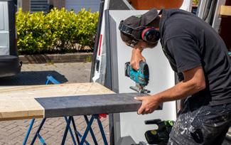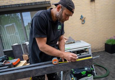 Vervolgens gaan de monteurs buiten een werkplek inrichten zodat zij hun werkzaamheden kunnen starten. Zaagtafels worden uitgestald, het materiaal wordt op lengte bij elkaar gelegd en bij regen of juist veel zon wordt de tent opgebouwd.