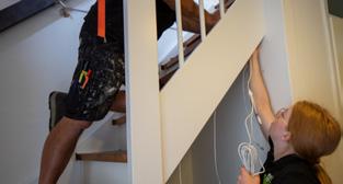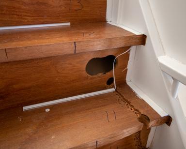Normaliter komen de draadjes van de ledverlichting aan de achterkant van de trap samen waarna we deze samenbinden en netjes wegwerken. Maar bij deze trap was dit bij de bovenste treden niet mogelijk, omdat deze zich boven het plafond bevinden. Daarom maakten we een gat om de bedrading van de ledverlichting via de voorkant van de trap te leiden. Het grote gat erboven is zodat de monteurs met hun handen in de trede kunnen om de bedrading door te trekken.