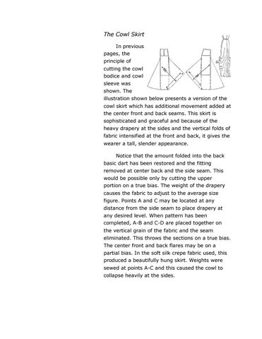 The Cowl Skirt In previous pages, the principle of cutting the cowl bodice and cowl sleeve was shown. The illustration shown below presents a version of the cowl skirt which has additional movement added at the center front and back seams. This skirt is sophisticated and graceful and because of the heavy drapery at the sides and the vertical folds of fabric intensified at the front and back, it gives the wearer a tall, slender appearance. Notice that the amount folded into the back basic dart has been restored and the fitting removed at center back and the side seam. This would be possible only by cutting the upper portion on a true bias. The weight of the drapery causes the fabric to adjust to the average size figure. Points A and C may be located at any distance from the side seam to place drapery at any desired level. When pattern has been completed, A-B and C-D are placed together on the vertical grain of the fabric and the seam eliminated. This throws the sections on a true bias. The center front and back flares may be on a partial bias. In the soft silk crepe fabric used, this produced a beautifully hung skirt. Weights were sewed at points A-C and this caused the cowl to collapse heavily at the sides.