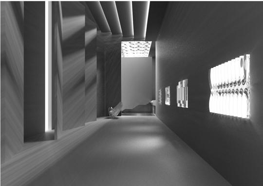 In the realm of architectural spatial design, our model informs the creation of various elements including walls, ceilings, sculptures, and furnishings. By analyzing the distribution of study images, the machine model delineates the proportions of each component. Guided by these findings, we seamlessly integrate diverse elements to orchestrate a cohesive journey for visitors, transitioning from areas characterized by sharp shadows to those suffused with ambient light. At the heart of this progression lies a shadowless exhibition space, fostering an uninterrupted engagement with the showcased artworks.