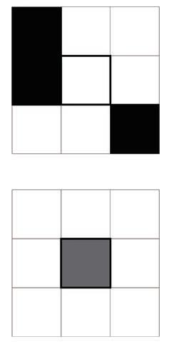 In the second phase, we incorporate decimal numbers to calculate the status of cells, thereby introducing additional states. As depicted in the image, gray blocks emerge between the white and black ones, indicating the presence of half-life cells.