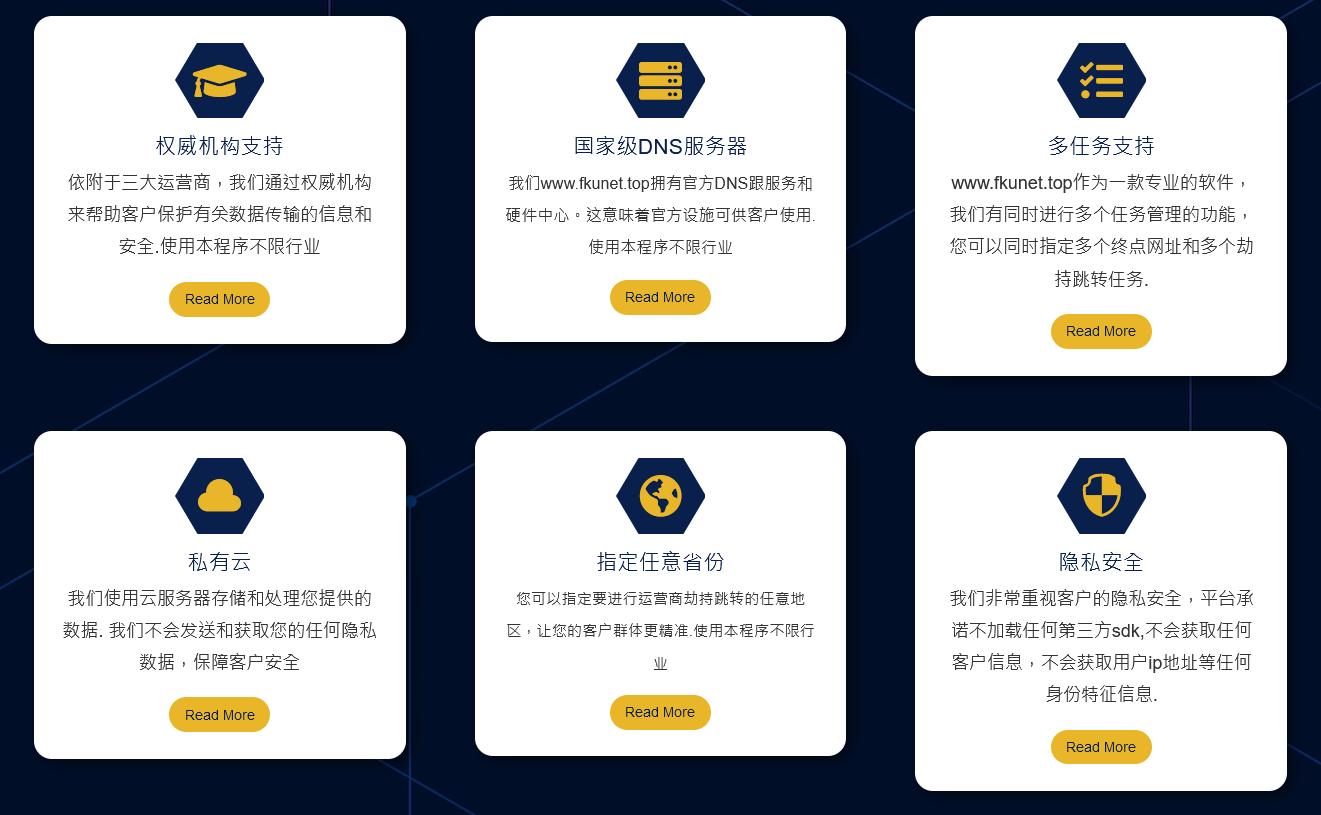 我们提供:任意网站跳转至您的网站、选择运营商、设 置劫持跳转时间段、选择省份等个性化服务方案